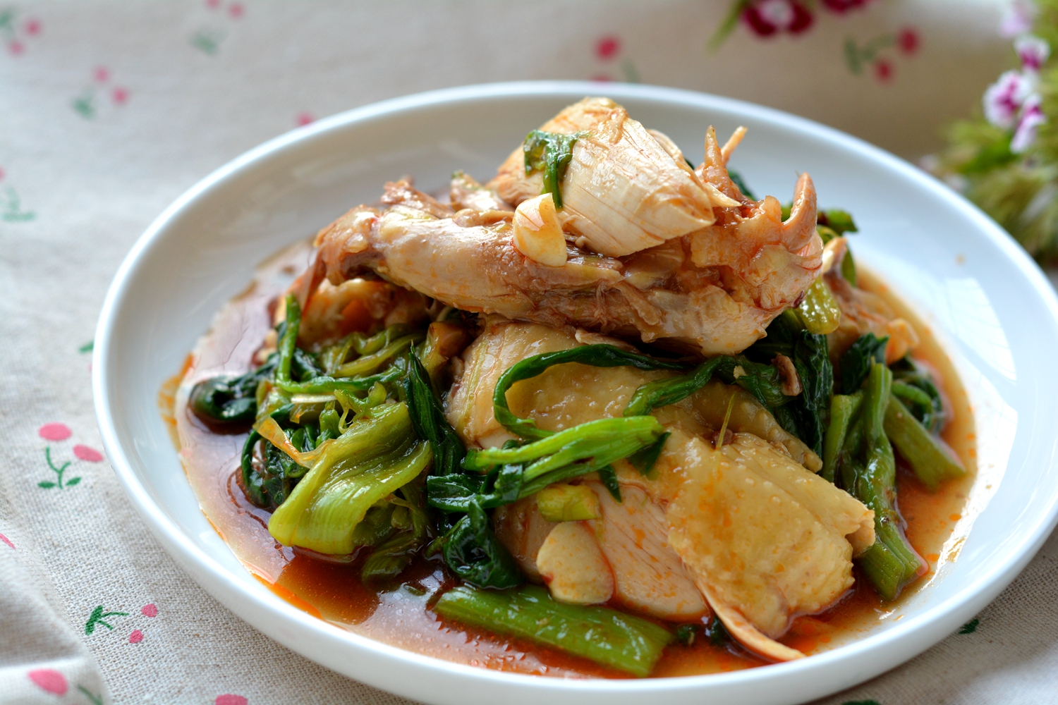 材料:菠菜一把,鸡半只,生抽适量,大蒜4瓣,葱少许,盐矢量,醋适量,豆豉辣酱2勺