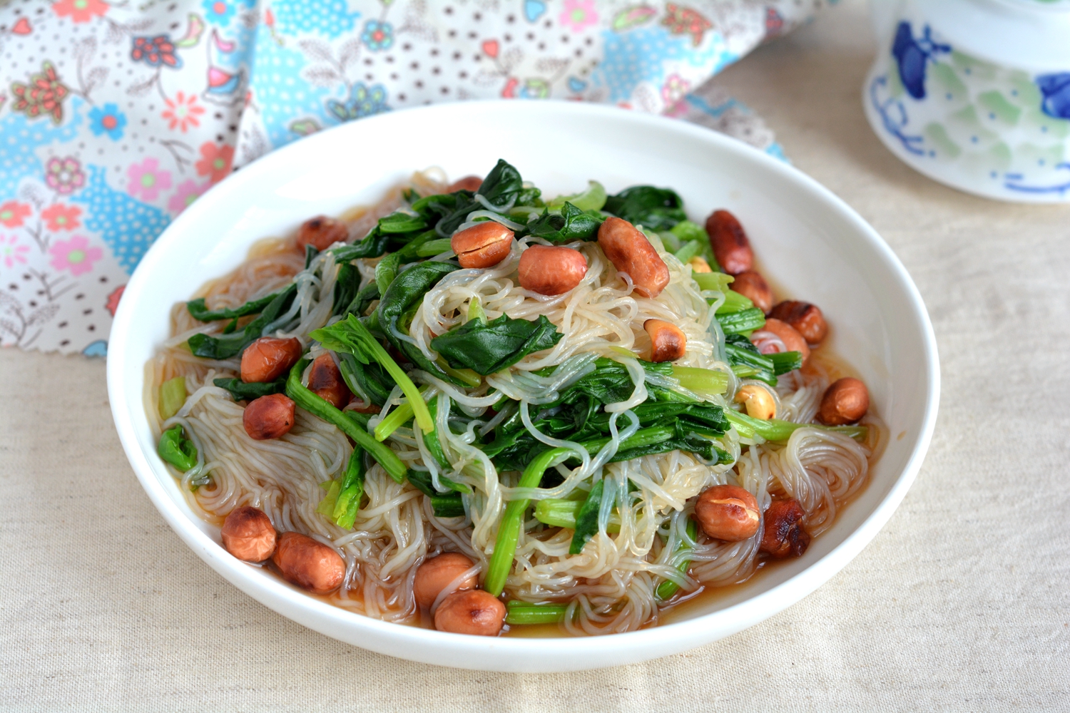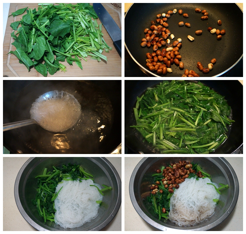 材料:菠菜一把,粉丝两小把,花生米一小碗,油少许,生抽适量,米醋适量,盐少许,白糖一小勺