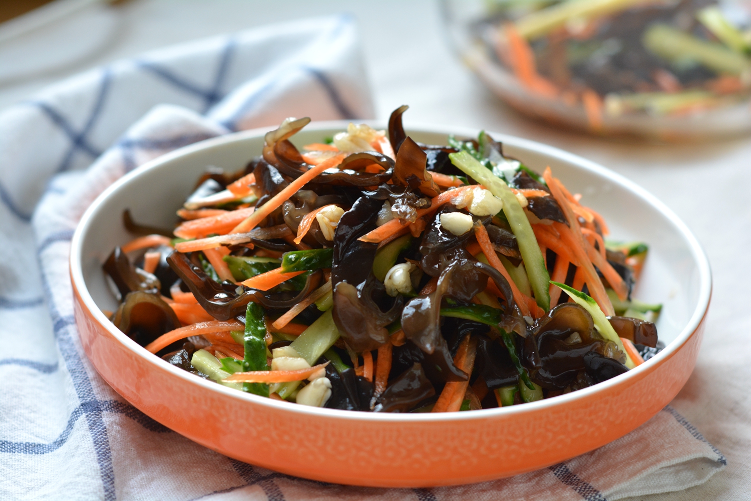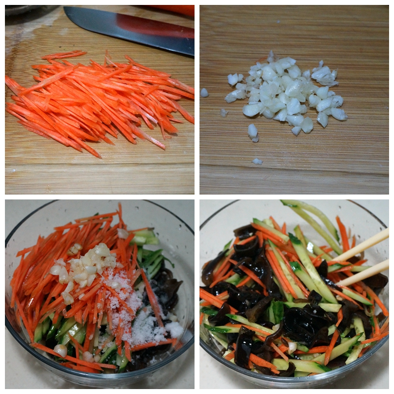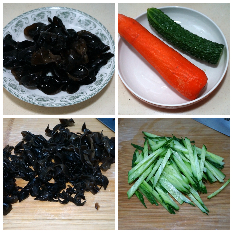 材料:泡发黑木耳一把,胡萝卜一根,黄瓜半根,大蒜数瓣,白糖一小勺,盐适量,生抽少许,醋适量