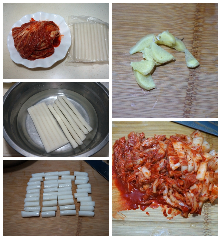材料:辣白菜1/4棵,火锅年糕10根,植物油少许,姜少许,酱油少许