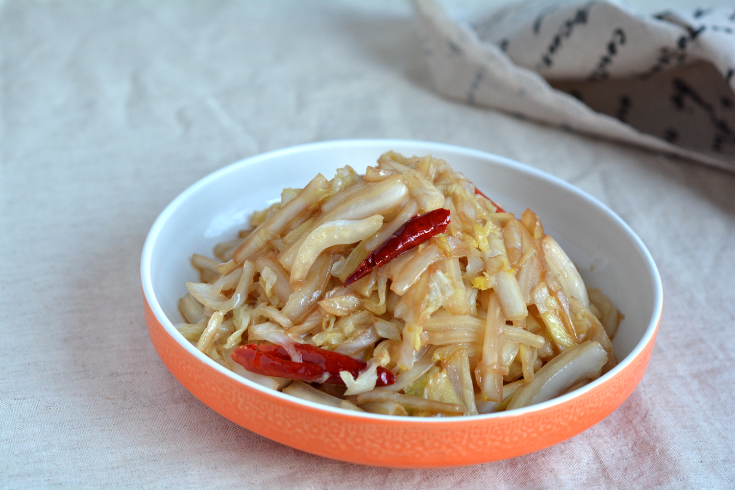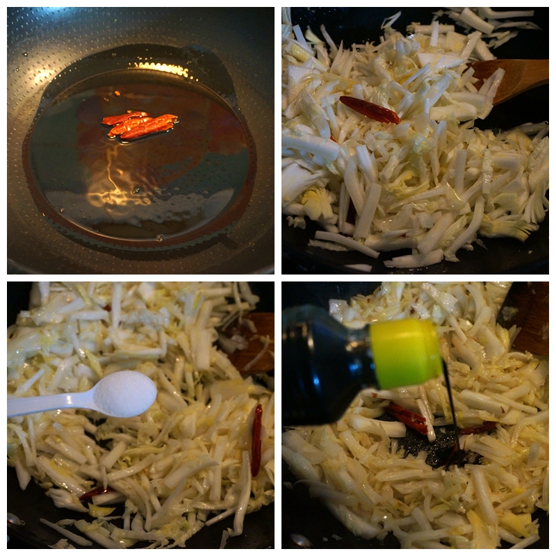 材料:白菜帮一棵,油适量,盐适量,生抽少许,干红辣椒3个