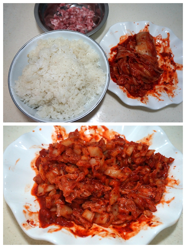 1. 剩米饭、辣白菜、肉馅准备好,剩米饭用勺子打散,防止结坨;