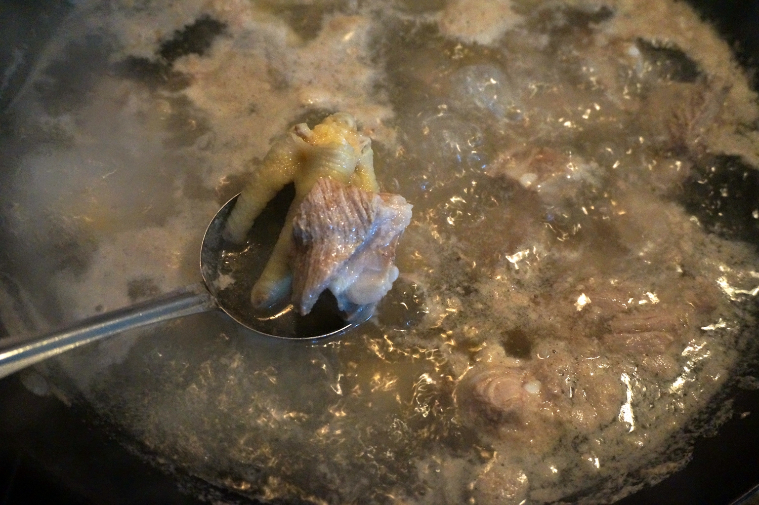 4. 鸡爪和排骨同入温水锅中煮开,从滚开的地方捞出,避开浮沫,可不用再冲洗了;http://si1.go2yd.com/get-image/0JgtCXtpVaK