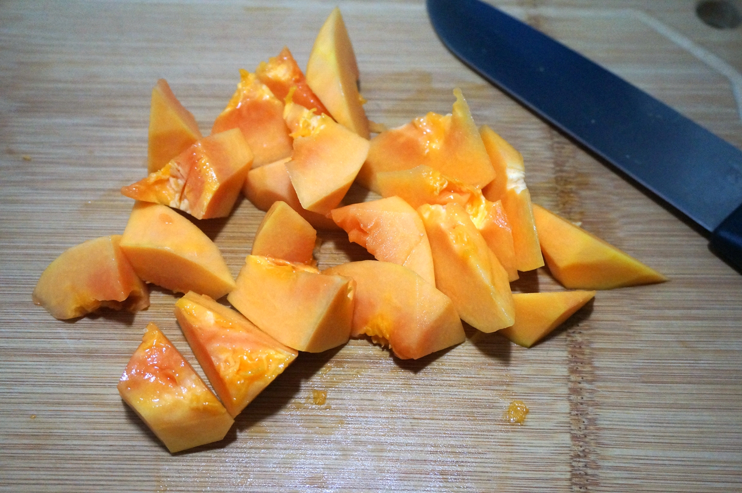 7. 关火前10分钟,将半个木瓜去籽去皮,切成滚刀块;http://si1.go2yd.com/get-image/0JgtFcNzUkS