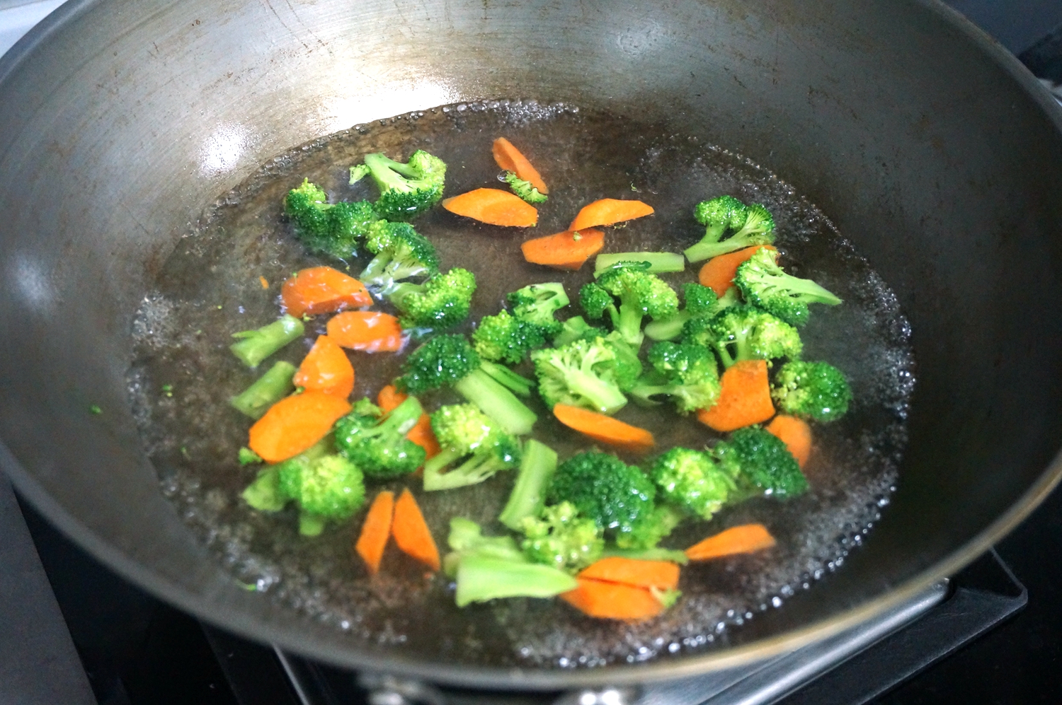 5. 西兰花和胡萝卜块焯水断生,沥干水备用;http://si1.go2yd.com/get-image/0JiVDdFUO9I