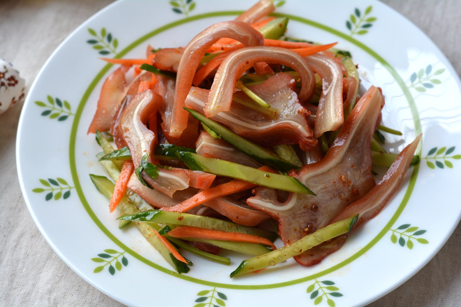 材料:卤猪耳一个,香菜2棵,黄瓜半根,胡萝卜1段,盐少许,生抽少许,醋适量,辣椒油适量 (大蒜数瓣)