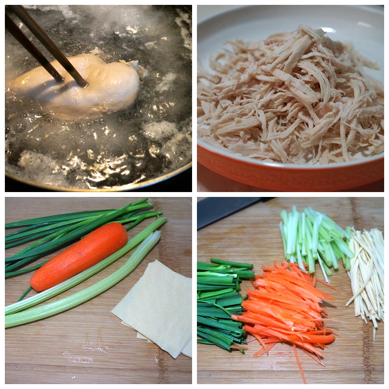 材料:鸡胸肉1块,胡萝卜1根,芹菜杆2根,自种小青蒜苗4根,豆腐皮(千张)适量,生抽适量,醋适量,盐少许,白糖一小勺,辣椒油适量