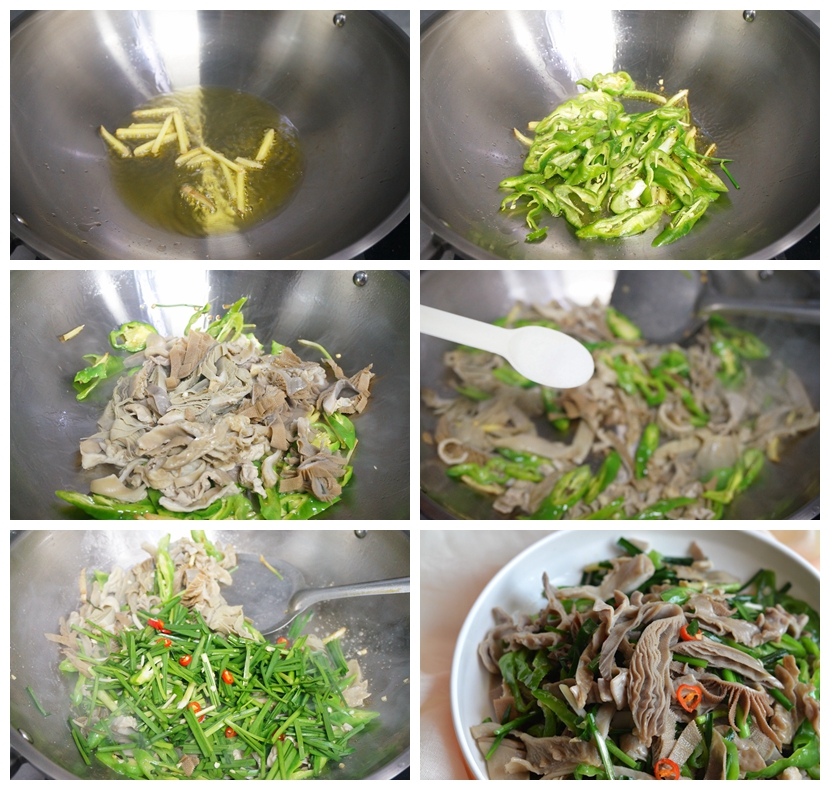 材料:羊百叶两个,辣椒两个,小米辣一个,韭菜一把,姜一小块,油适量,盐适量