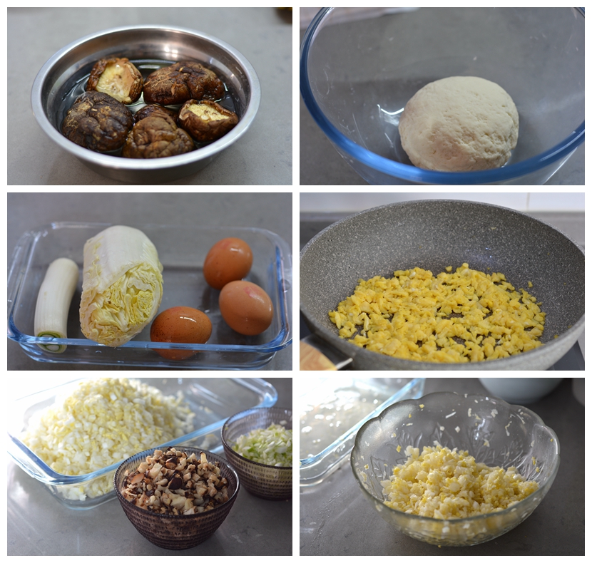 材料:新良煮制小麦粉适量,清水适量,鸡蛋3个,香菇5朵,白菜芯1个,油适量,盐适量,大葱半根