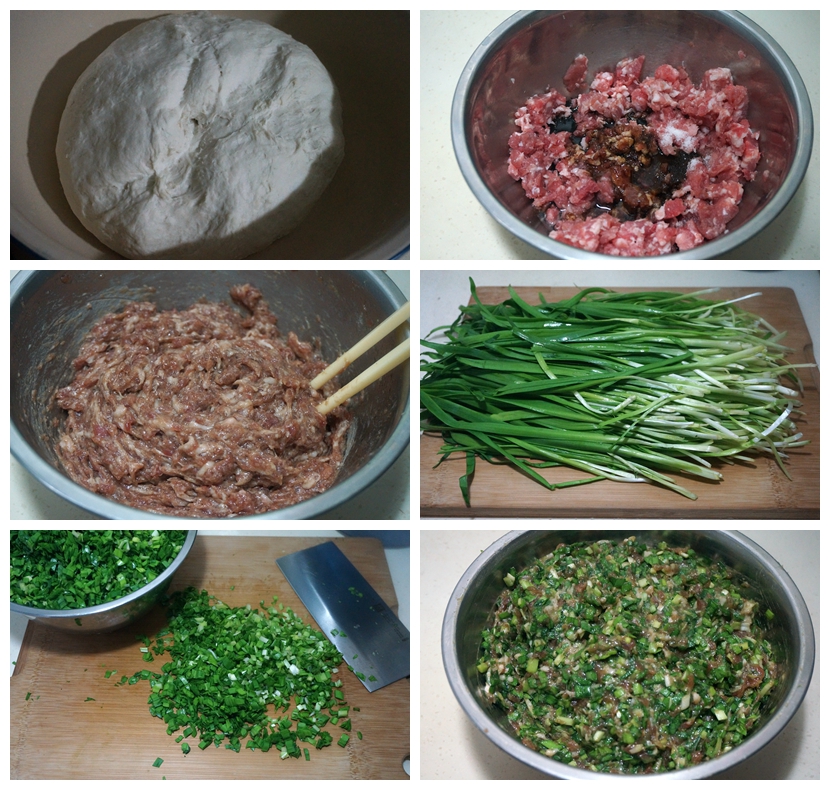 材料:猪肉馅,韭菜,酱油、生抽、盐、清水,植物油