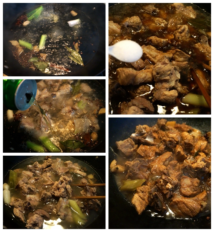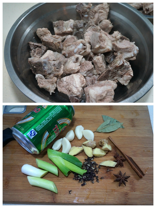 材料:猪脊骨1000克,清啤酒一听,清水适量,八角两颗,花椒一撮,大葱一棵,姜一块,桂皮一块,香叶两片,大蒜数瓣,盐适量,酱油适量