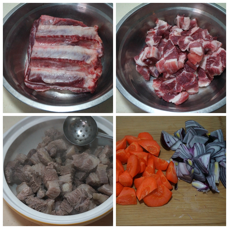 1. 牛肋条切成宽约3厘米的大块,入凉水锅,水开后煮两分钟,用小漏勺舀着然后捞出;