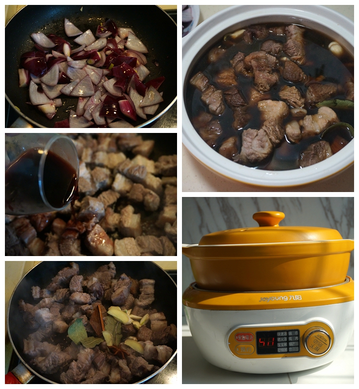 调料:红酒80毫升,姜1小块,八角2颗,桂皮1块,香叶3片,红烧酱油适量