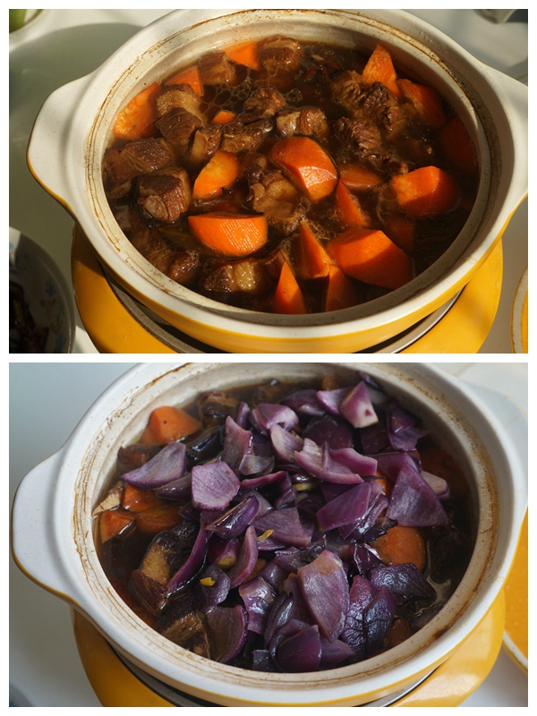 7. 牛肉差不多可以的时候,将胡萝卜放入其中炖熟;