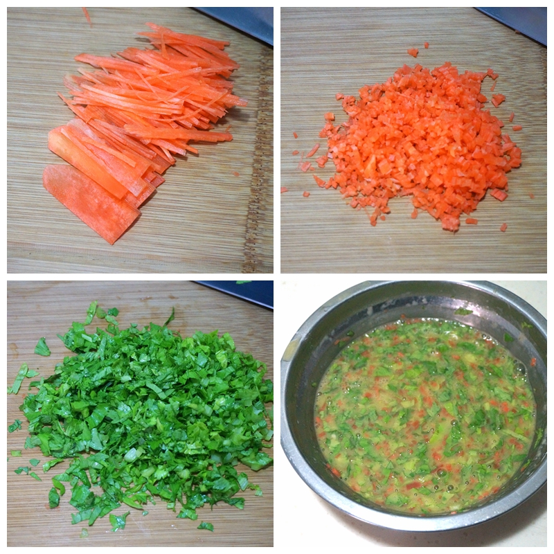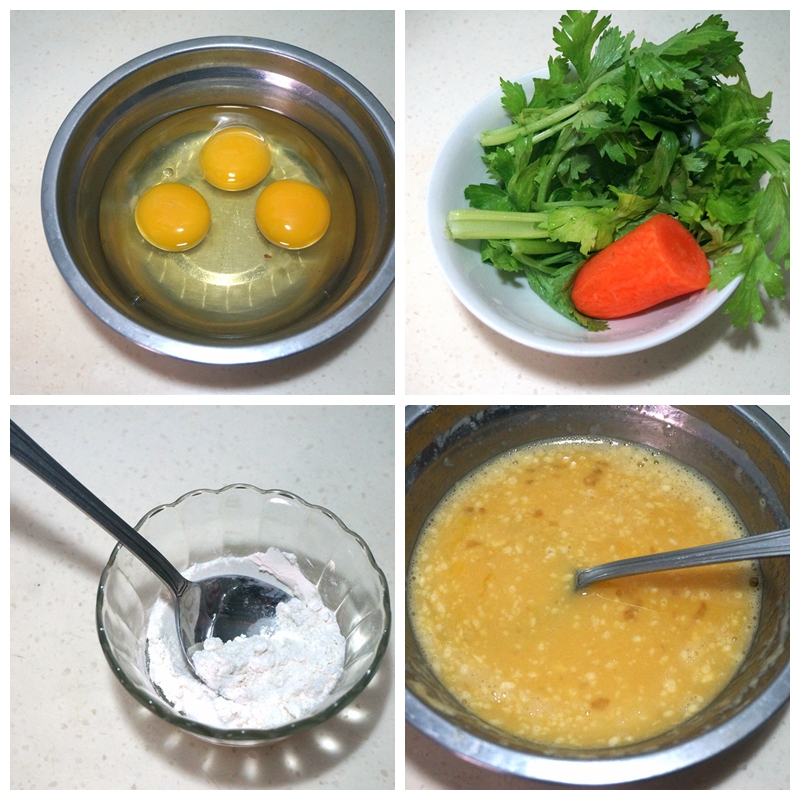 材料:鸡蛋3个,胡萝卜1段、芹菜叶1把,盐少许,油少许,面粉一小勺(约10克)