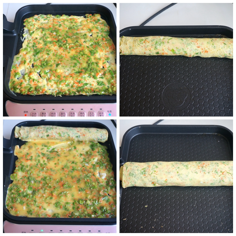 10.表面基本凝固时,将第一个蛋卷从那边再卷回来,封口朝下,防止开口;再将蛋卷在饼铛中来回滚几遍,确保里面没有生蛋液,吃时切块。http://si1.go2yd.com/get-image/0JpbQxkuAVM