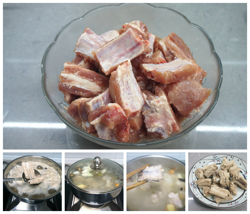 1.排骨剁小块,洗去残余的骨头渣,焯水备用;