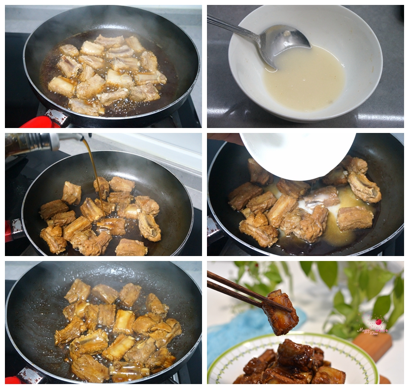 6.倒入热水,水不要太多,是刚好把排骨烧熟的量就成,让排骨能上色;