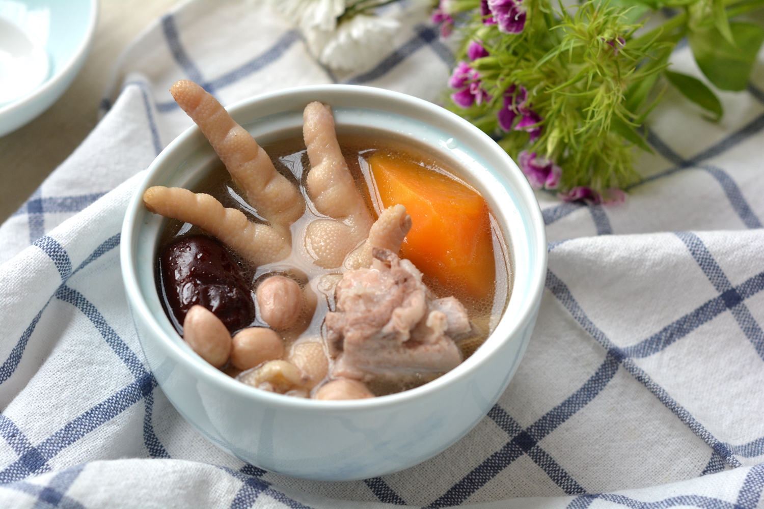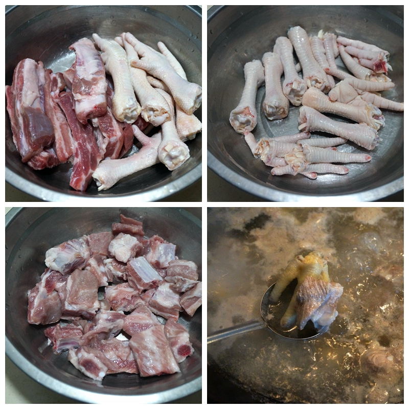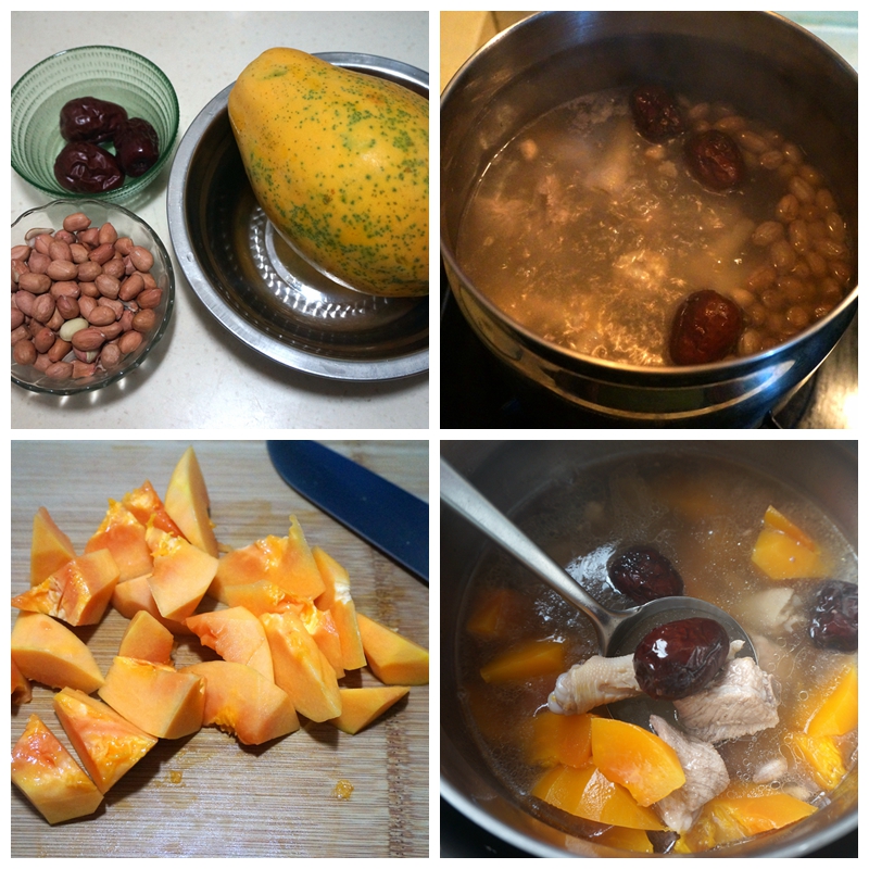 材料:排骨300克,鸡爪6个,木瓜半个,红枣3枚,花生一把,盐少许