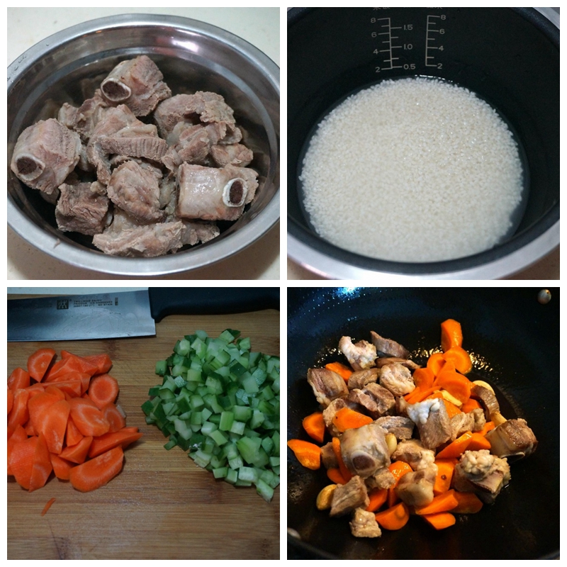 材料:大米两杯,肋排360克,胡萝卜一根,黄瓜一条,植物油少许,大蒜6瓣,酱油适量,盐适量