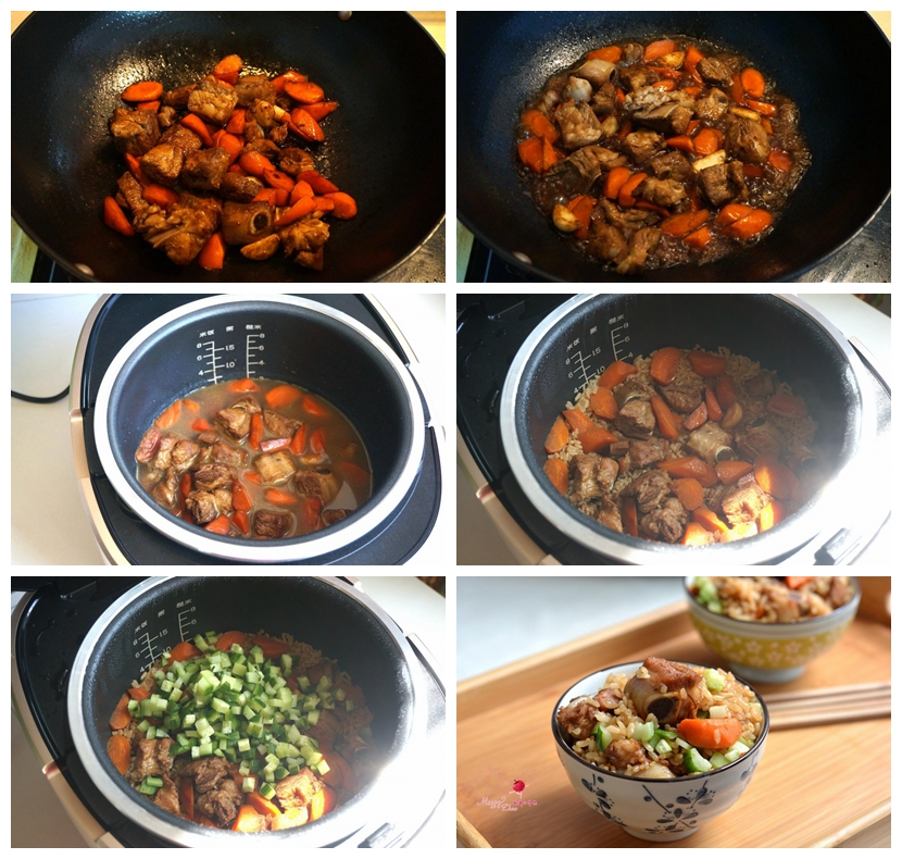 7.将排骨胡萝卜和汤汁一起倒入饭煲中的大米上,不要翻动;