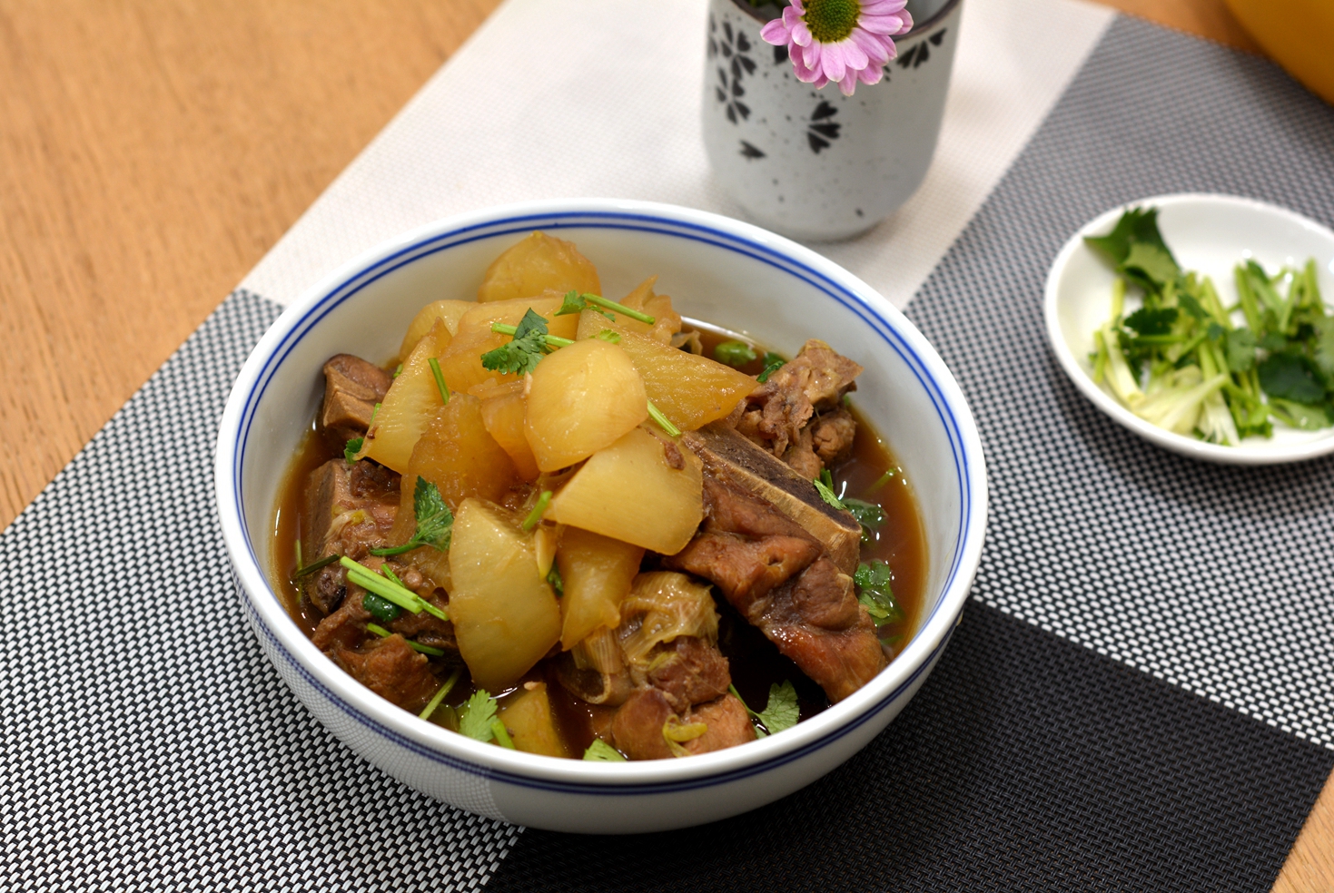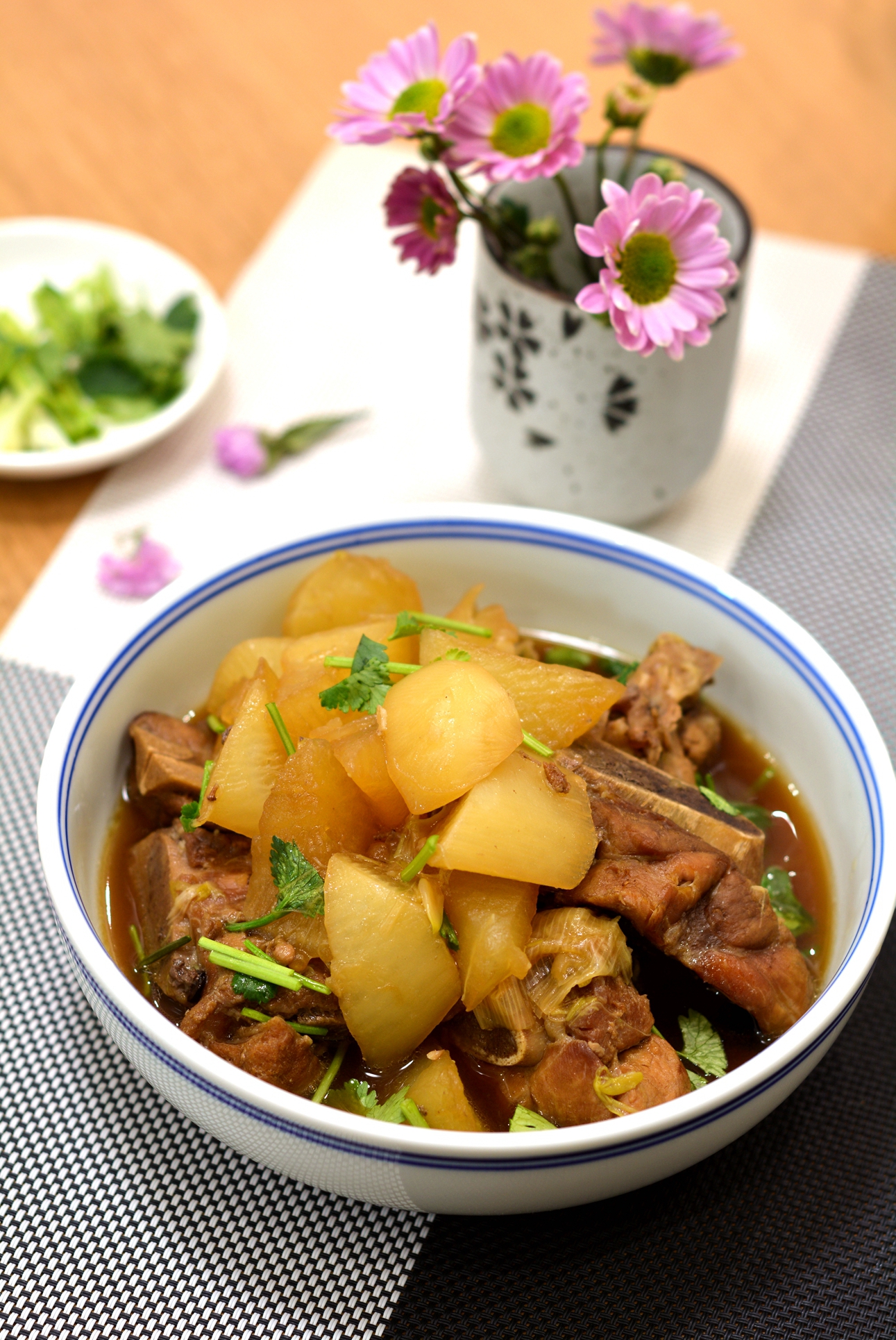 材料:脊骨500克,白萝卜1根,酱油适量,料酒少许,大葱半根、花椒一撮,八角2颗,水适量,香菜少许