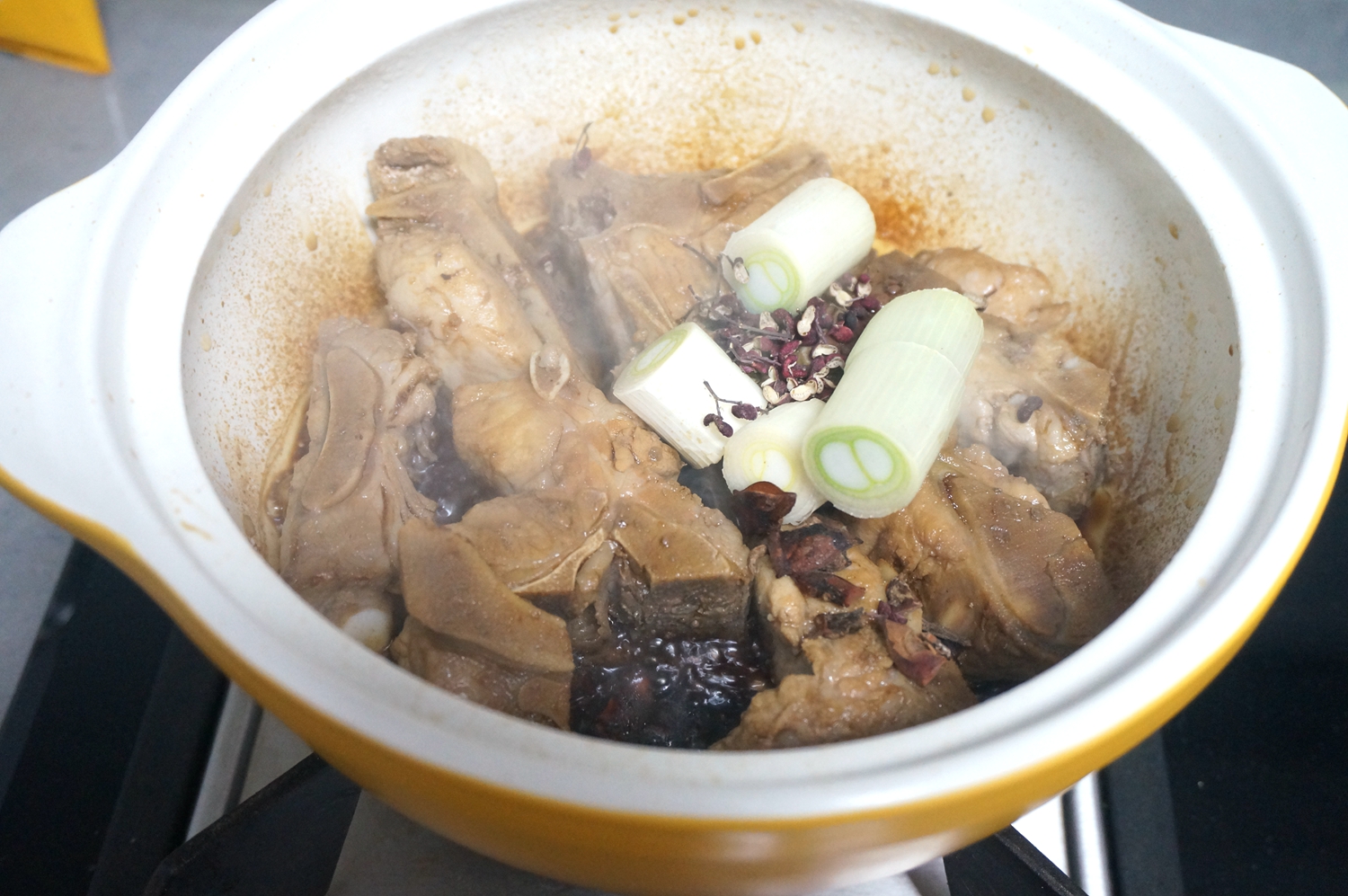 3. 猪脊骨入砂锅中,倒少许料酒、酱油,翻拌后使肉能蘸满酱汁,再将葱段、八角、花椒同入锅中;http://si1.go2yd.com/get-image/0JywyqzOgka