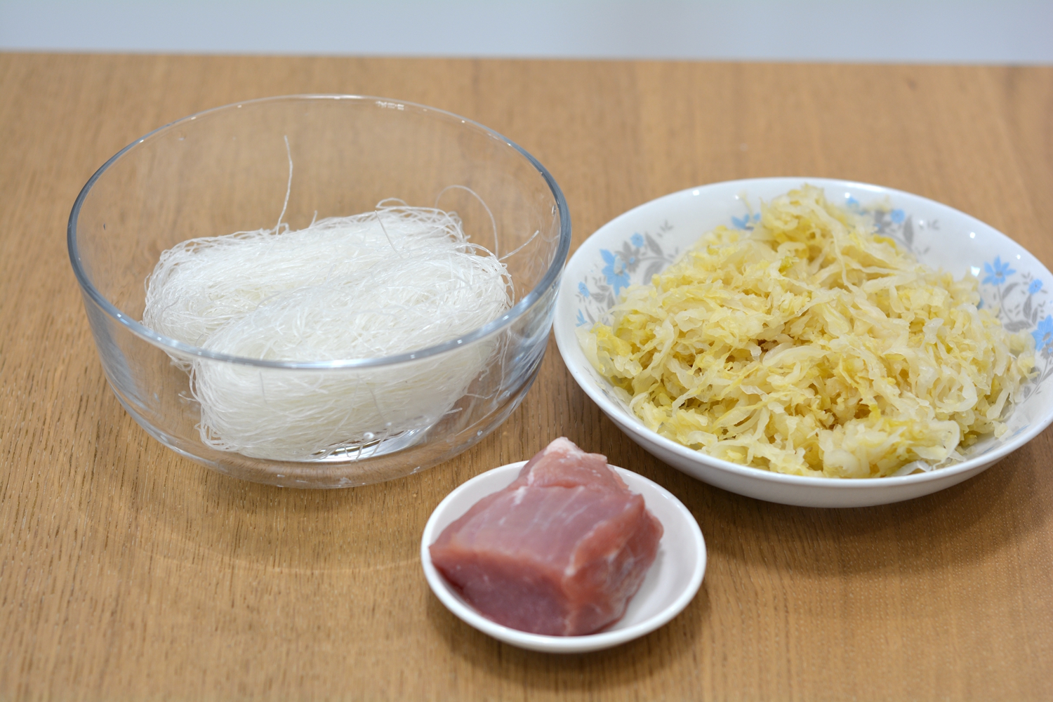 材料:酸菜一盘,粉丝2小捆,猪肉100克,油适量,酱油少许,盐少许,葱花少许,水少许,淀粉少许,料酒少许;