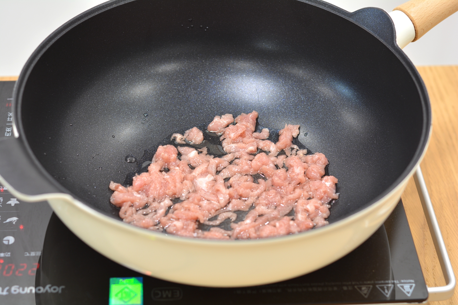 4. 炒锅加中火加热,倒油,凉油时就将肉丝入锅中,轻轻划散,倒入葱花,再转大火炒变色;http://si1.go2yd.com/get-image/0K0H5Hb0JOq