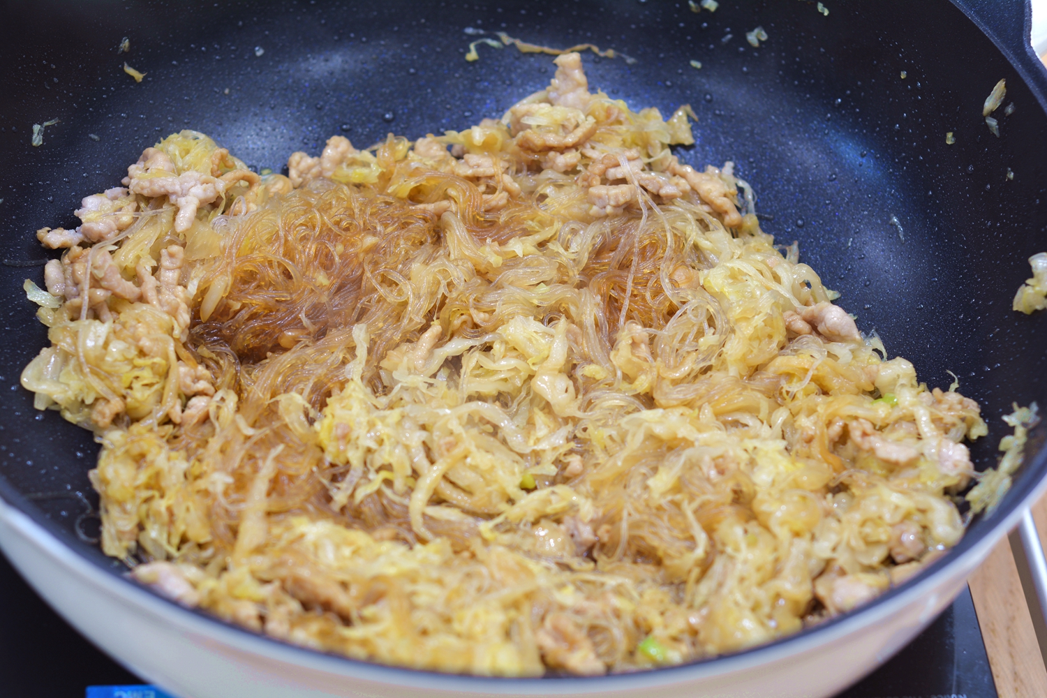 6. 撒盐、倒少许酱油,有点颜色的菜,北方人还是很喜欢的,再把粉丝倒入锅中混合,倒少许水煮两分钟,粉丝成熟变软并吸足了菜汁,出锅。