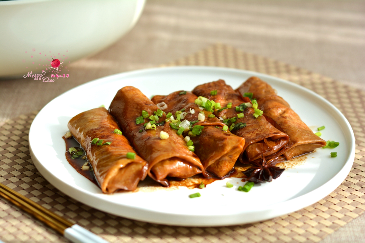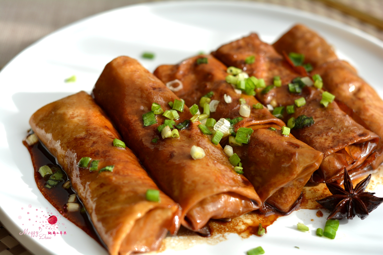 今天我就用豆腐皮做一道豆腐皮肉卷。卷成卷,肉汁全部包在内部,吃起来鲜嫩多汁,再经过酱汁的浸润,非常入味儿,是一道又下饭又下酒的绝佳小菜。其做法也不难,将泡软的豆腐皮切块后包上腌制入味的肉馅,放在锅中略煎一下定型,倒少许酱油和水、一颗八角慢慢炖十分钟,那真是满屋飘香啊!端上桌,其别致的造型,浓香的口感,米饭都要不够吃了!http://si1.go2yd.com/get-image/0K3rJu1Z4iG