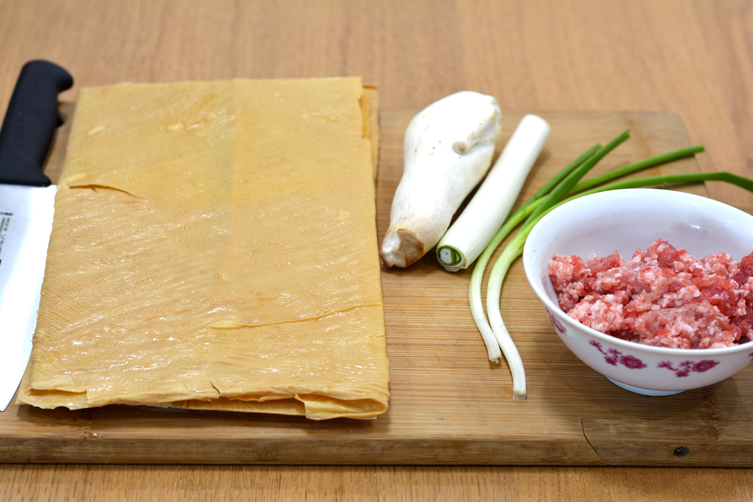 1. 干豆皮、肉馅、杏鲍菇、大葱、香葱准备好;http://si1.go2yd.com/get-image/0K3rL3thKmO
