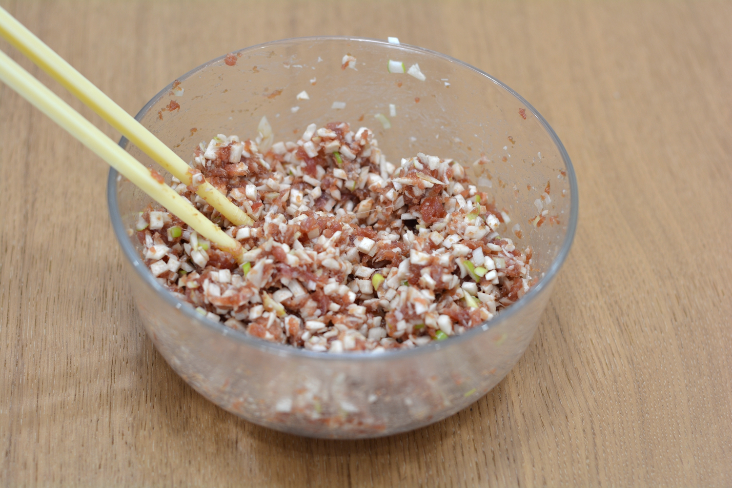 5. 杏鲍菇、大葱末入肉馅中,搅拌均匀;http://si1.go2yd.com/get-image/0K3rP6WsKm0