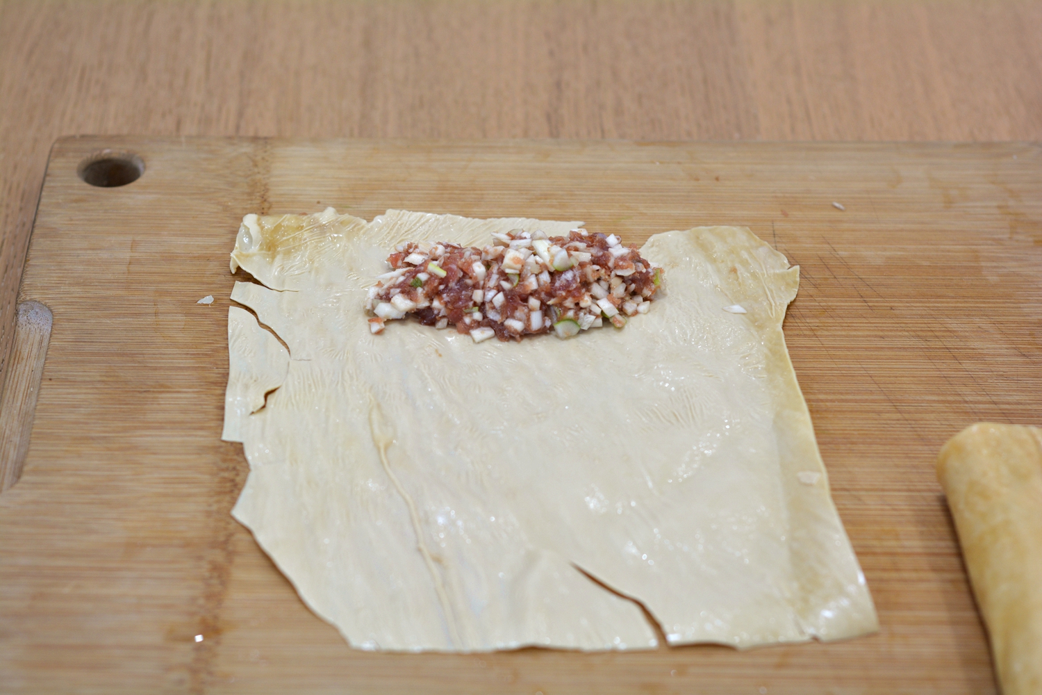 6. 将泡软的豆腐皮打开,切成小块,大小可以随自己的喜欢,但不建议太小,否则卷不起来;放适量的肉馅在底部中央;http://si1.go2yd.com/get-image/0K3rQbCtoaO