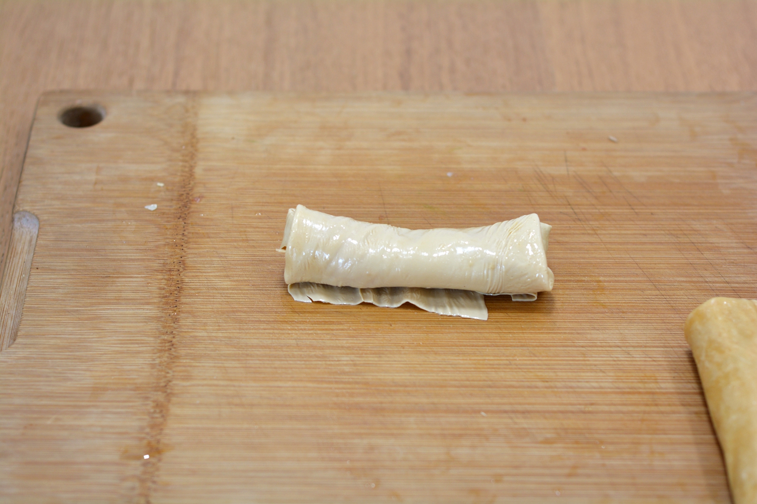 7. 由下向上卷一圈,再将两端向内折,最后卷成卷,封口处抹一点水淀粉,这样入锅后才不会散开;http://si1.go2yd.com/get-image/0K3rRxm9YuG