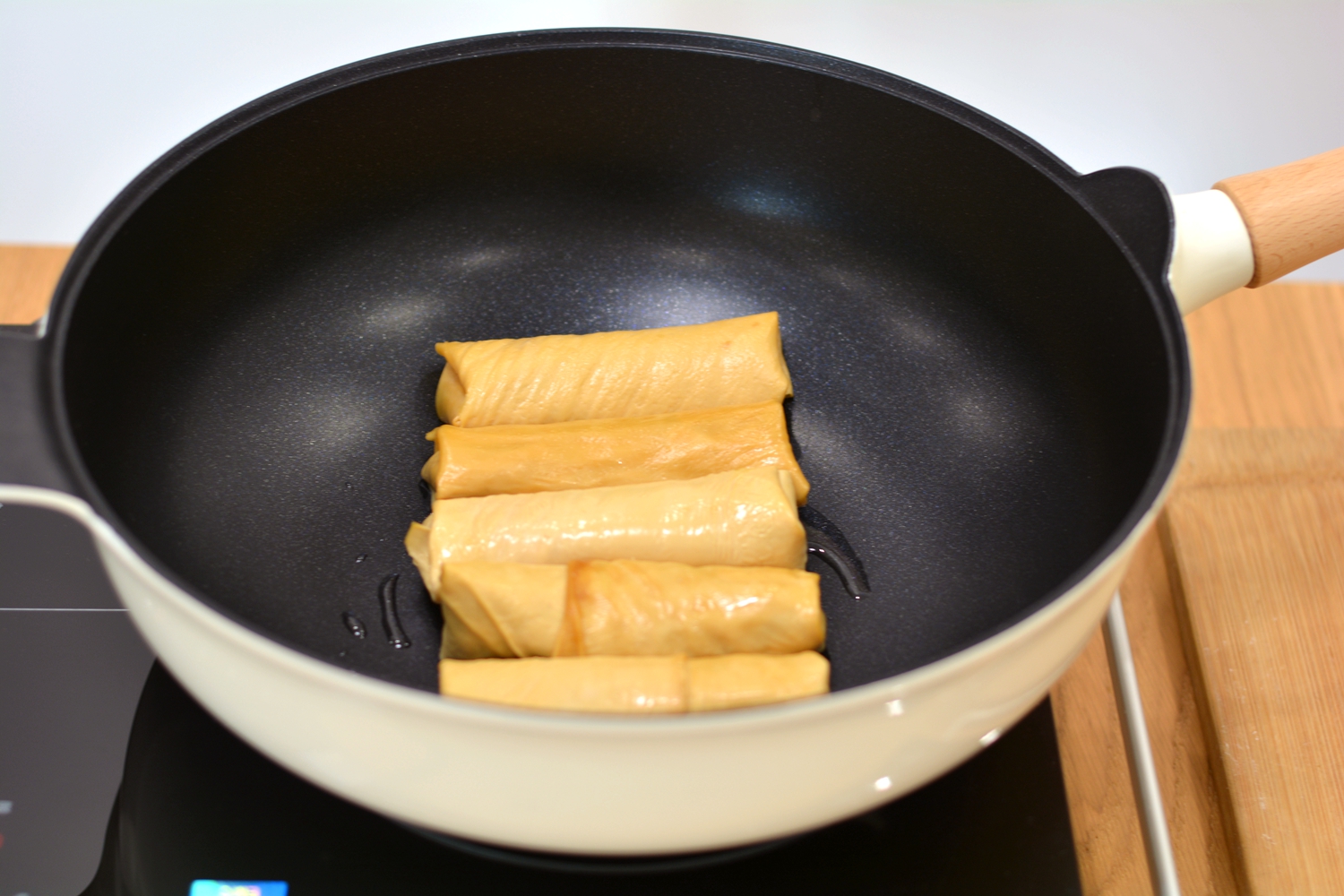 9. 炒锅中倒少许油,直接将豆腐皮肉卷封口朝下,码放在锅中,待油温逐渐上升,豆腐卷封口牢固了,翻面煎;http://si1.go2yd.com/get-image/0K3rValWVGq