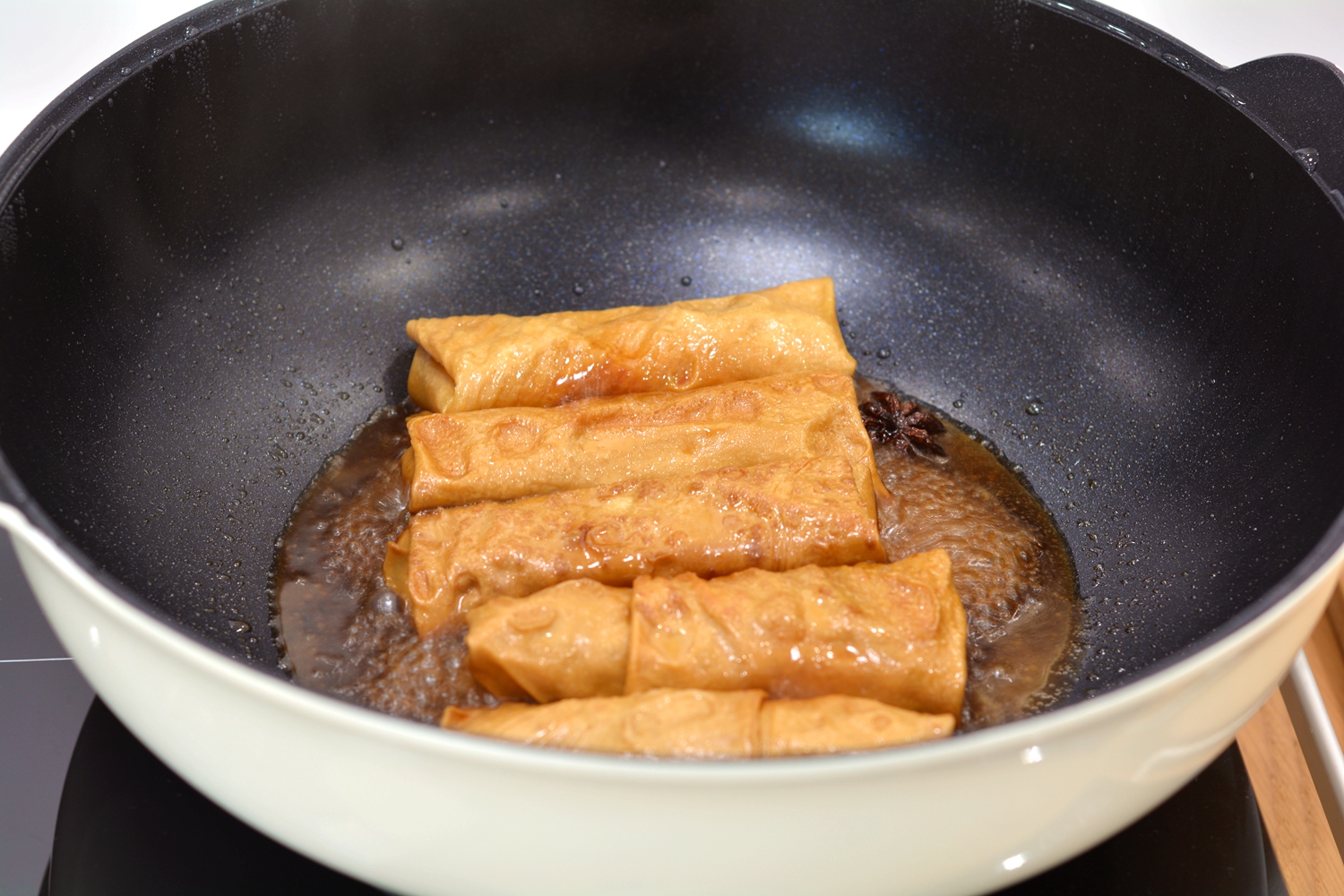 2. 小火慢炖,更利于豆皮入味,豆卷内肉嫩多汁,一咬爆汁;