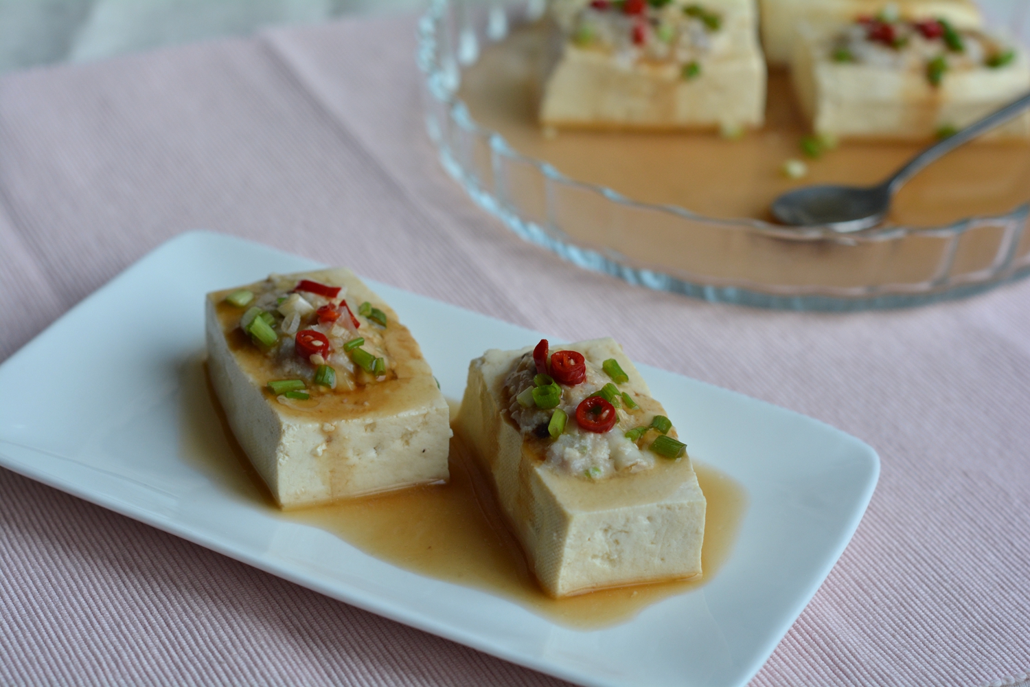 6. 取一块豆腐,把肉馅填入其中,中间略高出一些;