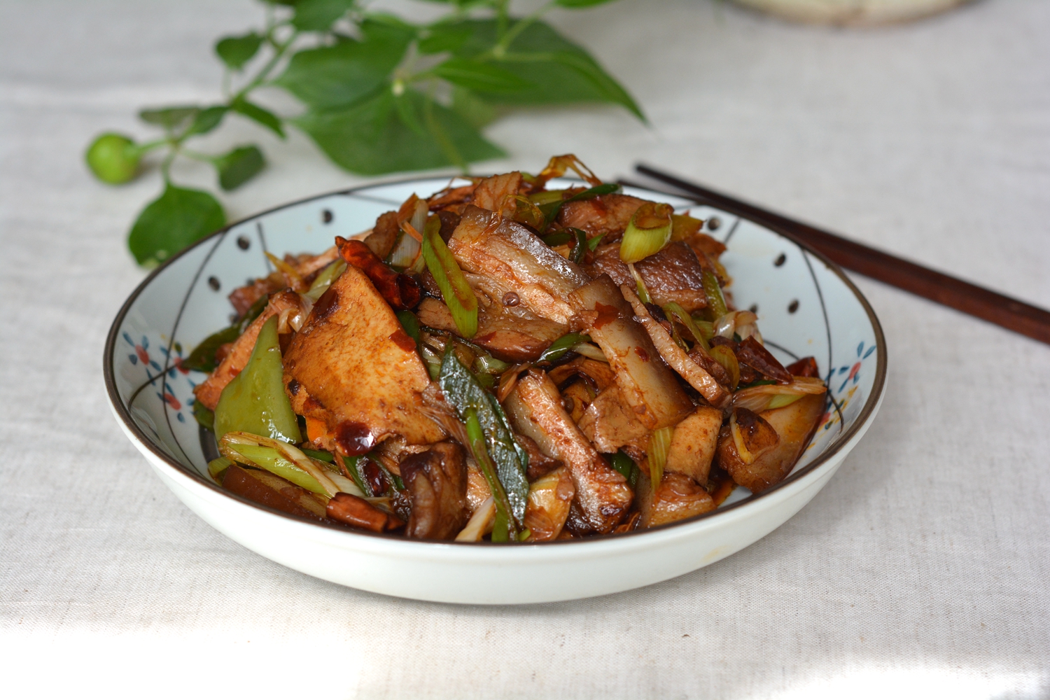 材料:煮熟的五花肉,五香豆腐干2块,青蒜2棵(也可用大葱),尖椒半根,干红辣椒4个,大蒜数瓣,豆瓣辣酱一小勺,植物油少许,酱油少许,米醋少许