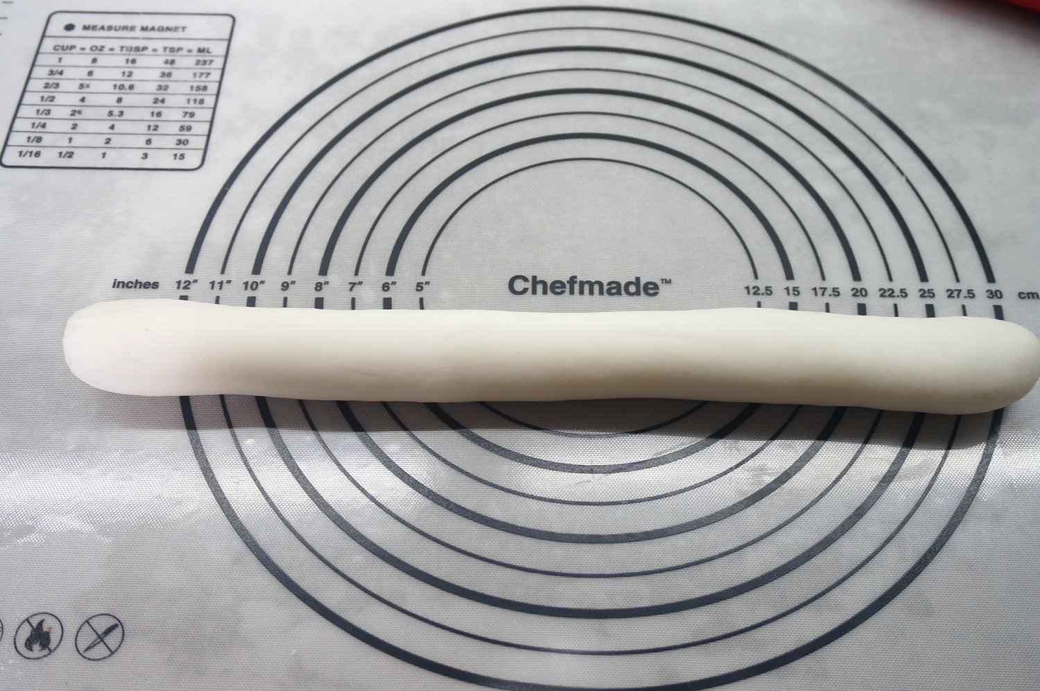 4. 饧好的糯米面团放在揉面垫上使劲揉3分钟,使面团更加光滑,再搓成擀面杖粗细的长条;http://si1.go2yd.com/get-image/0K4Onl4FXaS