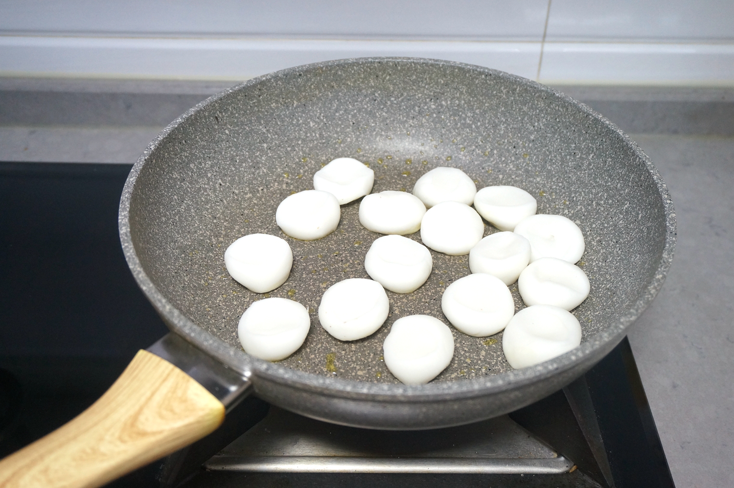 6. 不粘炒锅中倒几滴菜籽油,用其它油我也不拦着,都成呵,将糯米饼一一码放在锅里;http://si1.go2yd.com/get-image/0K4OpmQZCDY