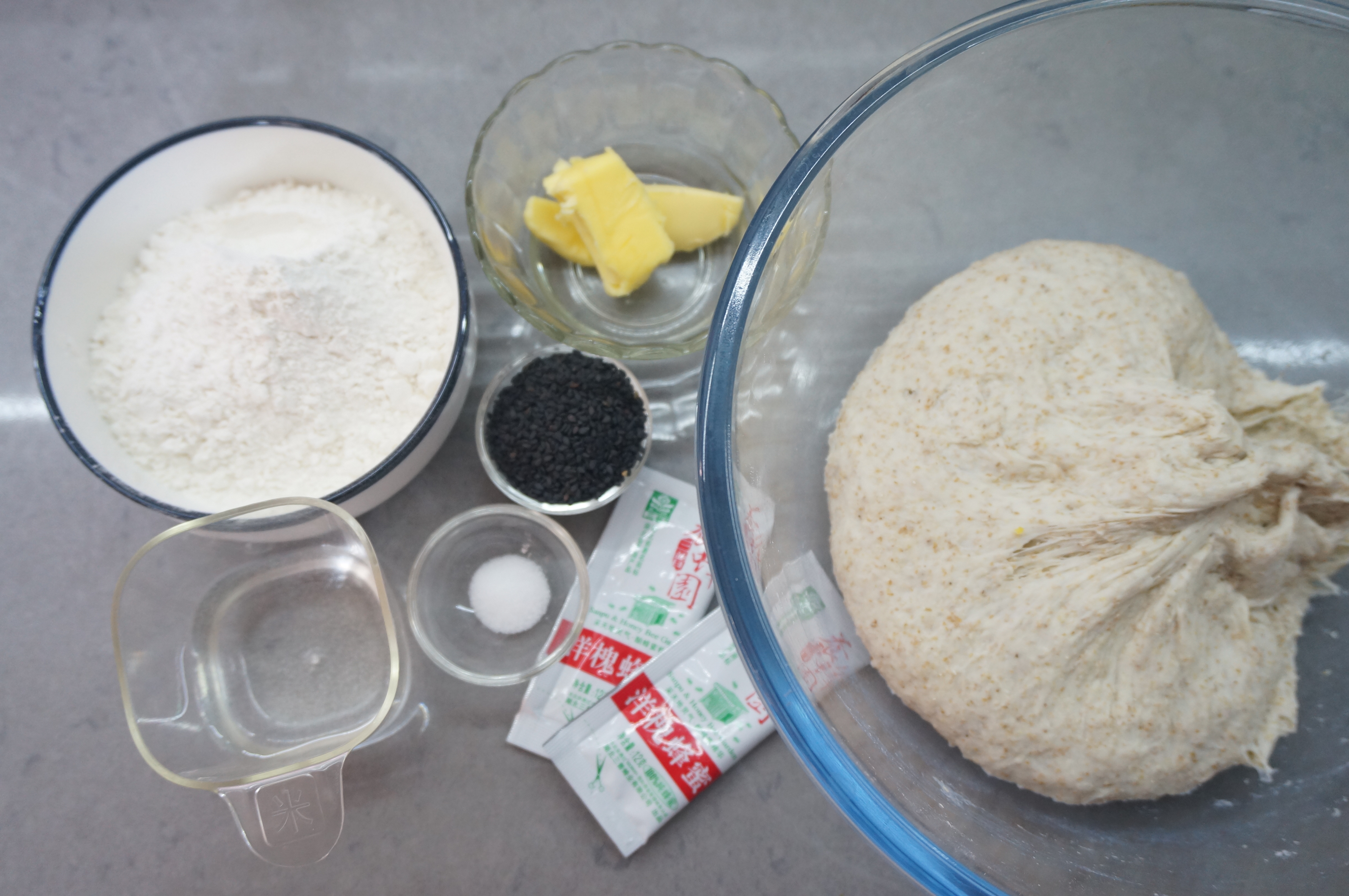 2. 将主面团的材料称重准备好:高筋面粉95克,盐2克,蜂蜜24克,凉水50克,黄油 15克,黑芝麻 20克;http://si1.go2yd.com/get-image/0K8vUeufYTw