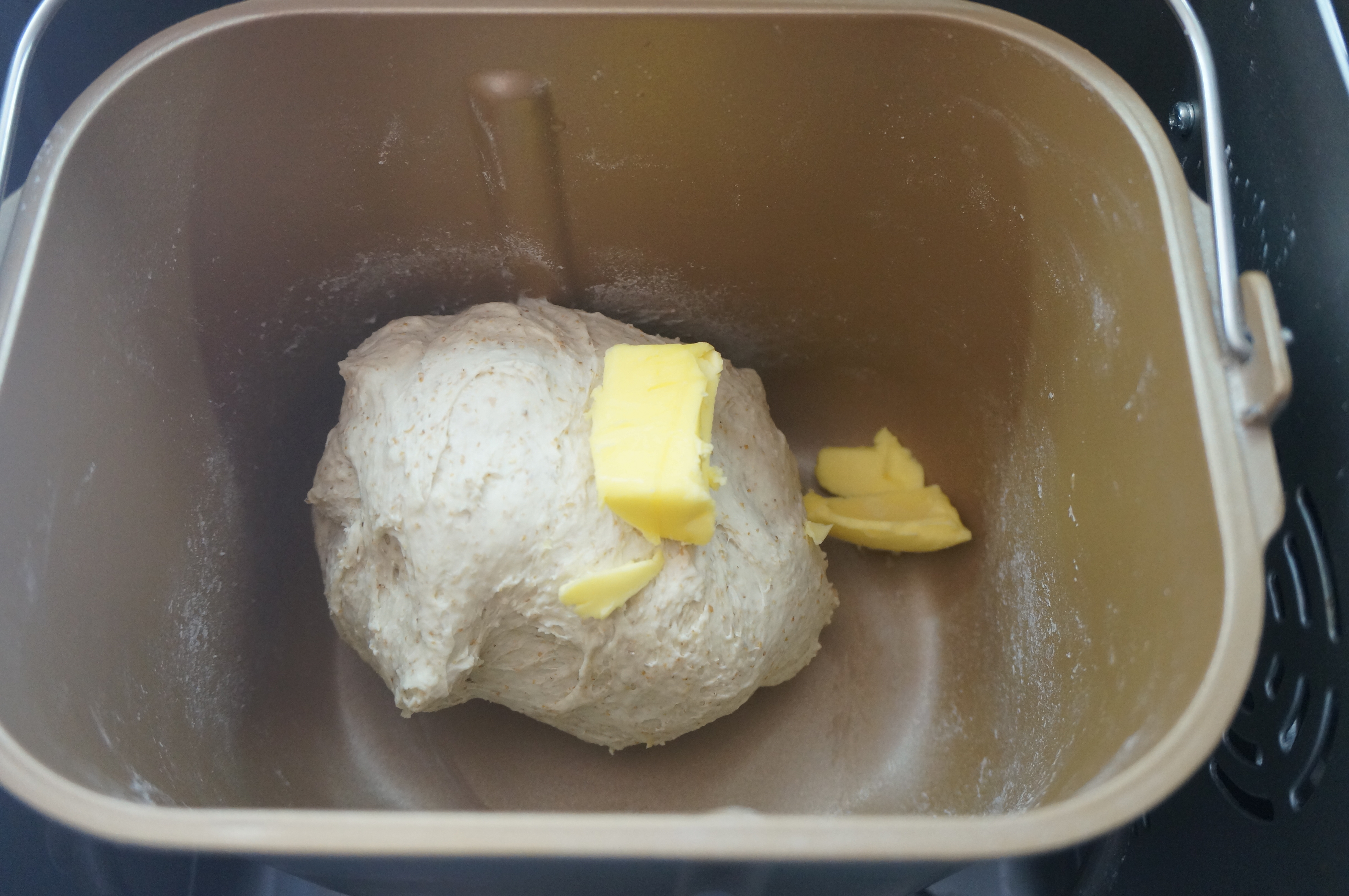 4. 除黄油、黑芝麻以外的全部材料入面包桶中,中种面团揪或者剪成大块即可,启动揉面程序10分钟,然后将软化的黄油块倒入面包桶中;http://si1.go2yd.com/get-image/0K8vZYzG2We