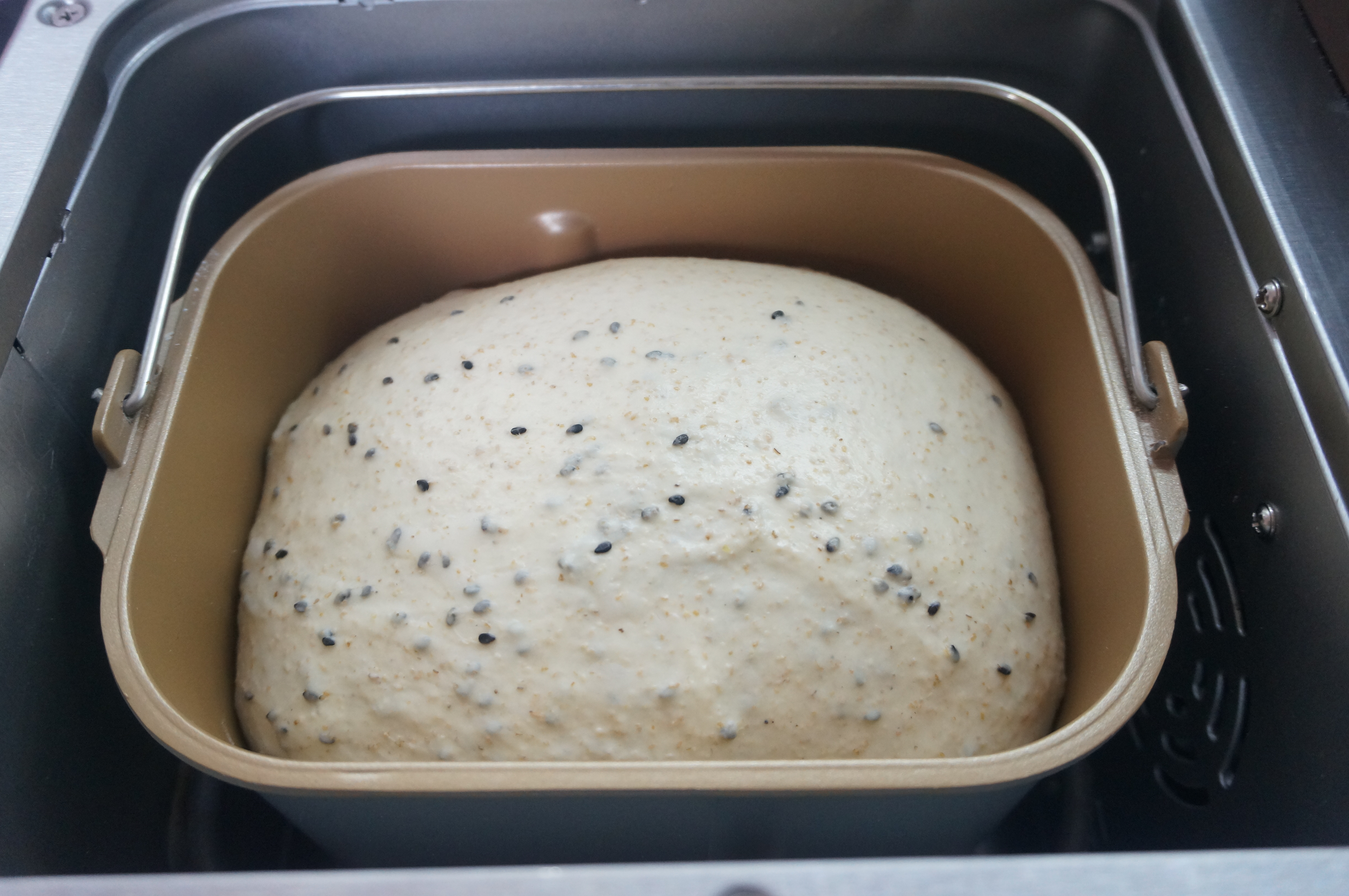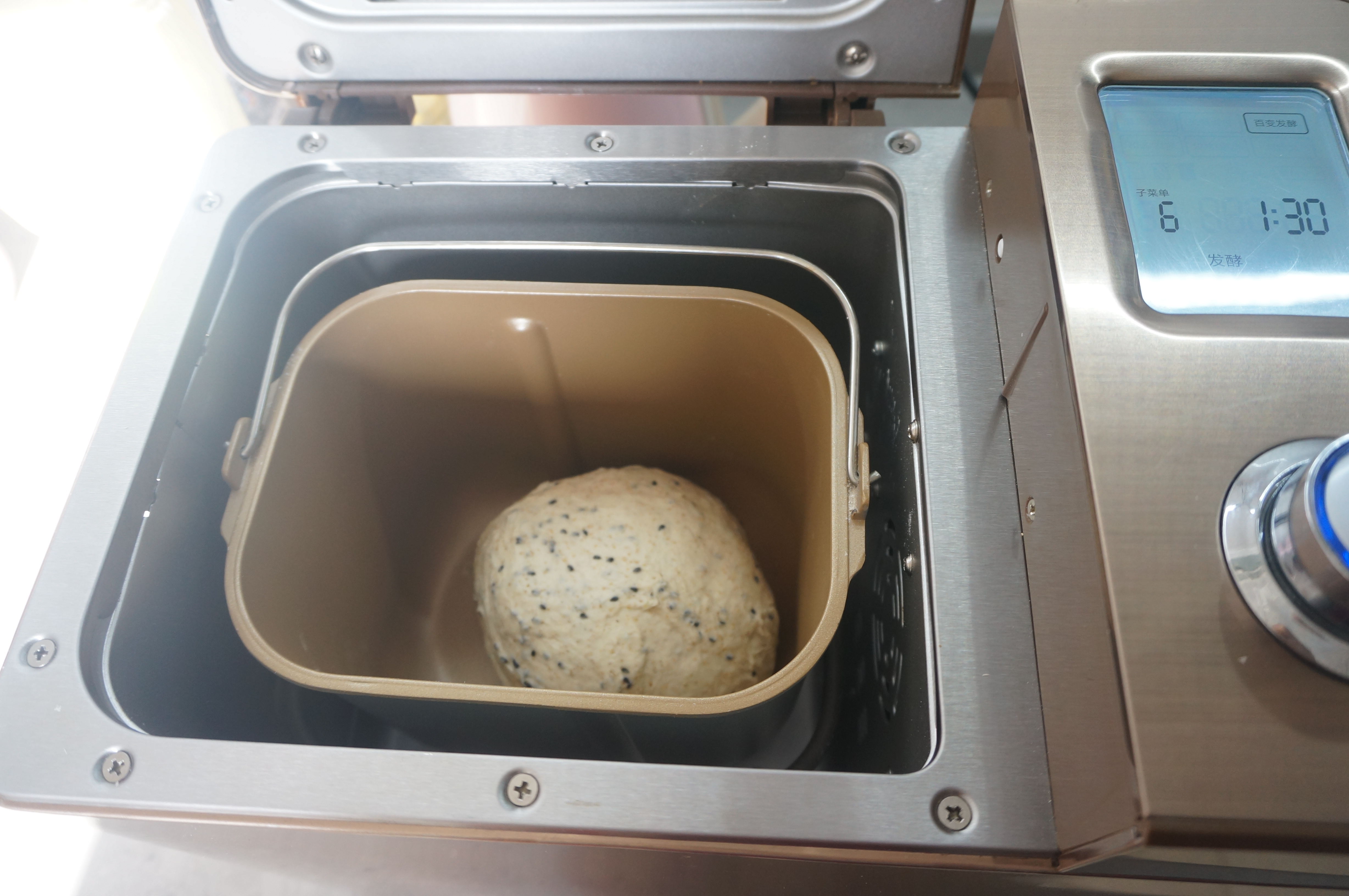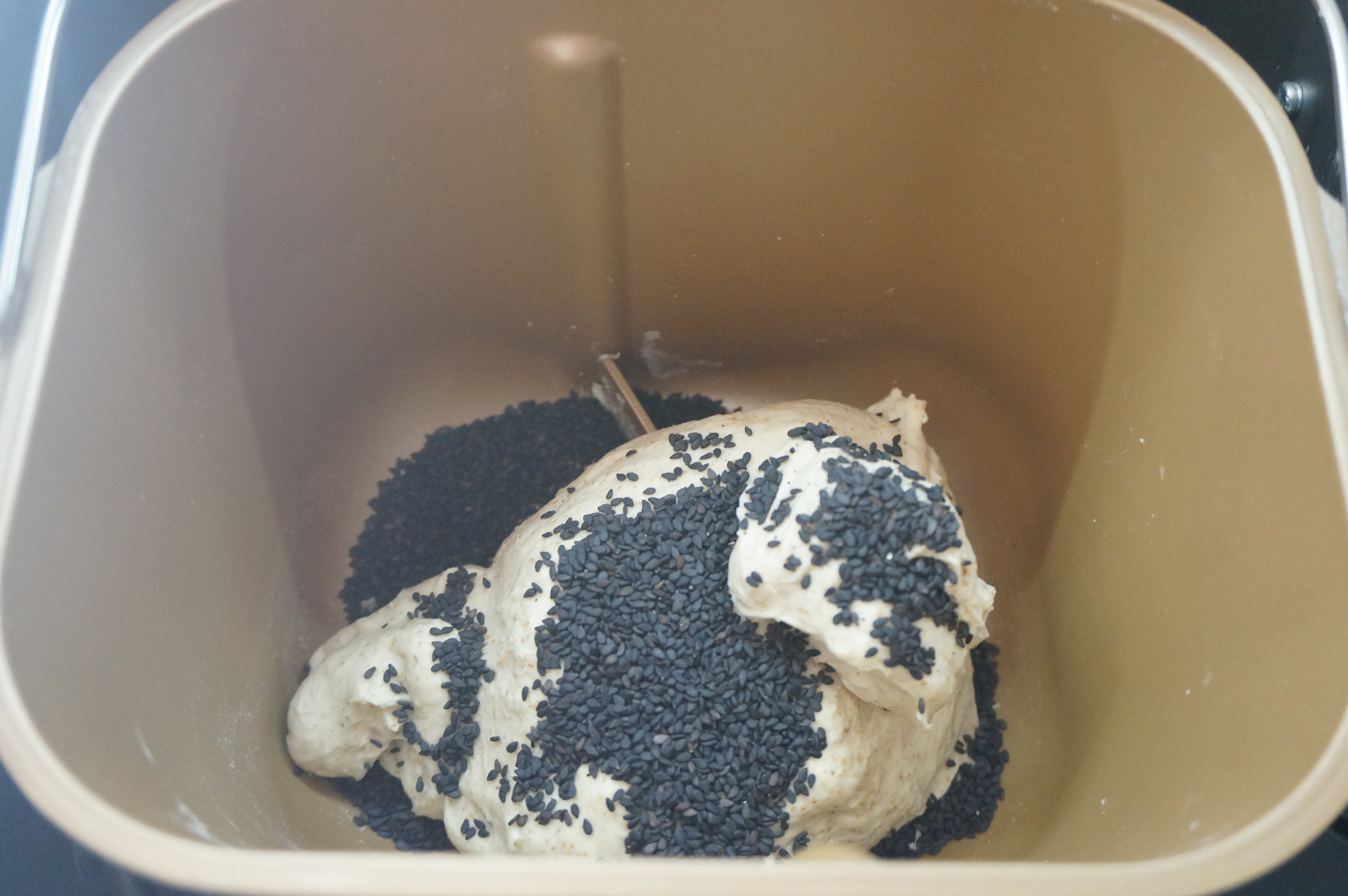 6. 将黑芝麻倒入面包桶中,继续揉2分钟左右,待黑芝麻完全和面团混合均匀,千万别时间过久,防止面筋被拉断;http://si1.go2yd.com/get-image/0K8vcd1lgQK