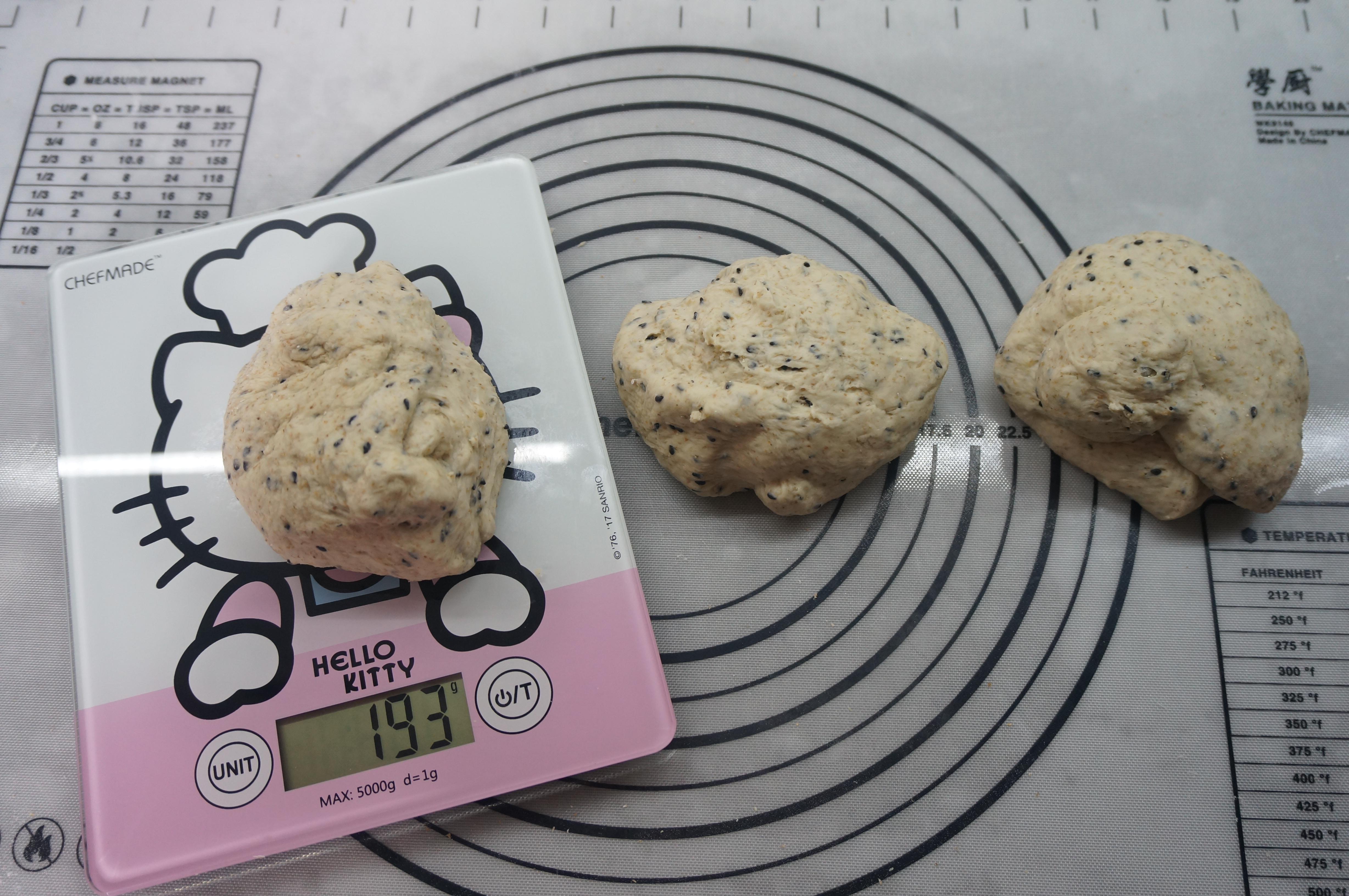 9. 面团取出放在揉面垫上,揉几把后称重分成3等份,再分别揉圆,盖保鲜膜松弛10分钟;http://si1.go2yd.com/get-image/0K8vhC7PoZM