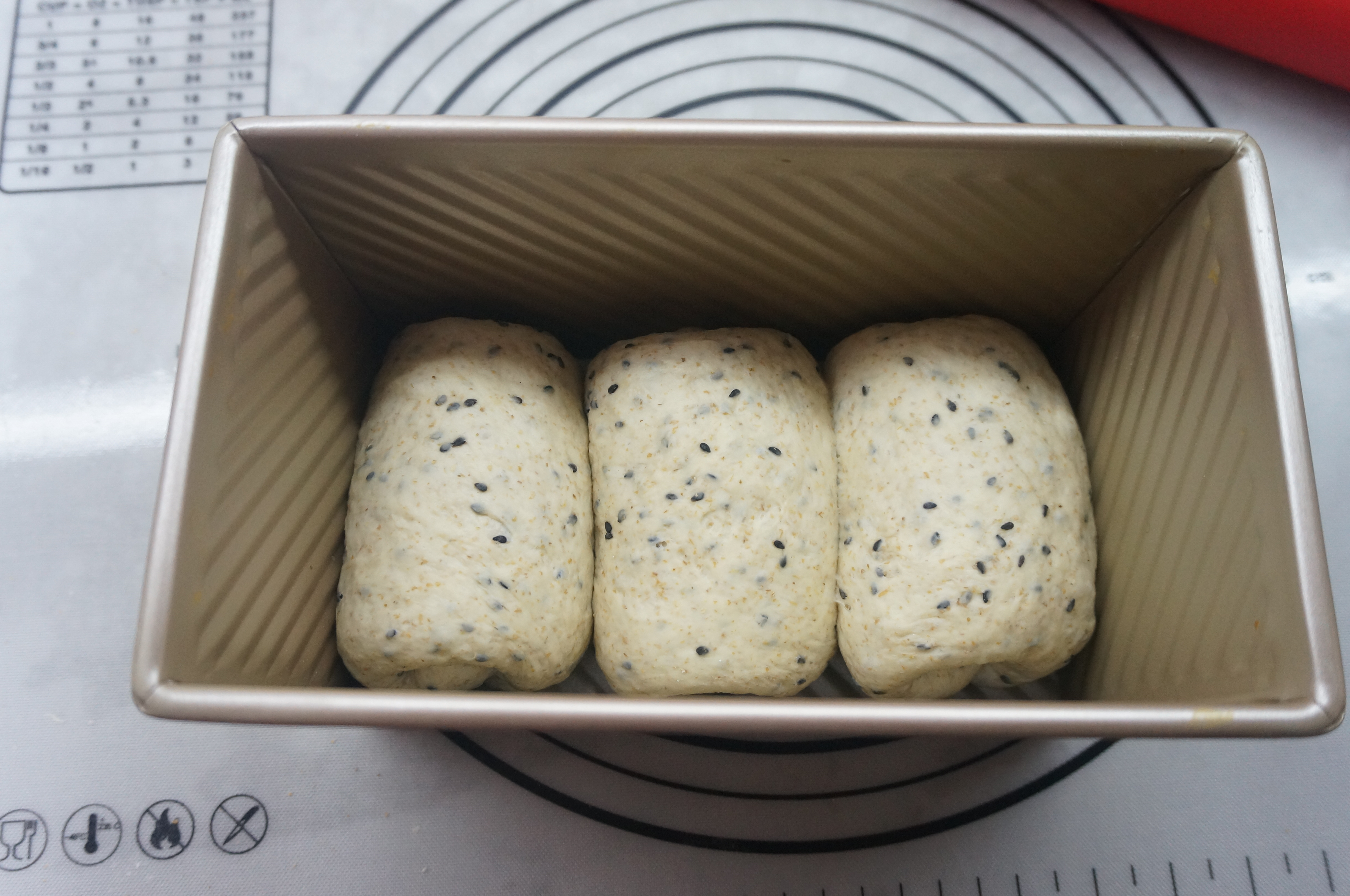 14. 卷好一个码放在450克吐司盒中,先码放中间的,再码放两边的,放在温暖湿润处发酵;我是放在烤箱中,放了一碗水,没有调温,就是烤箱中的温度;http://si1.go2yd.com/get-image/0K8voCyPmuu