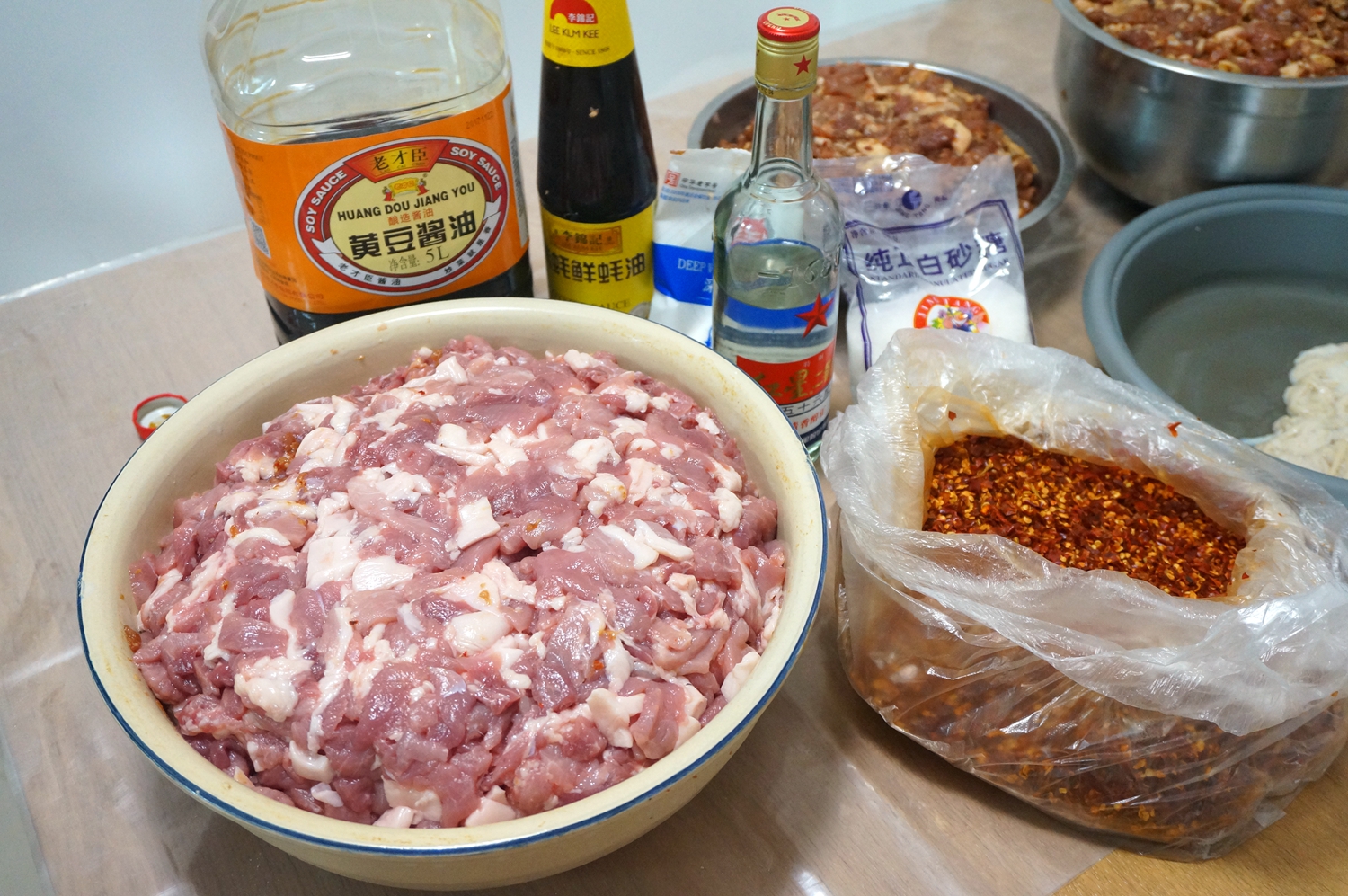 材料:猪前后臀尖肉(略带肥更香)、高度白酒、酱油、蚝油、盐、白糖、辣椒粉、清水、盐渍肠衣
