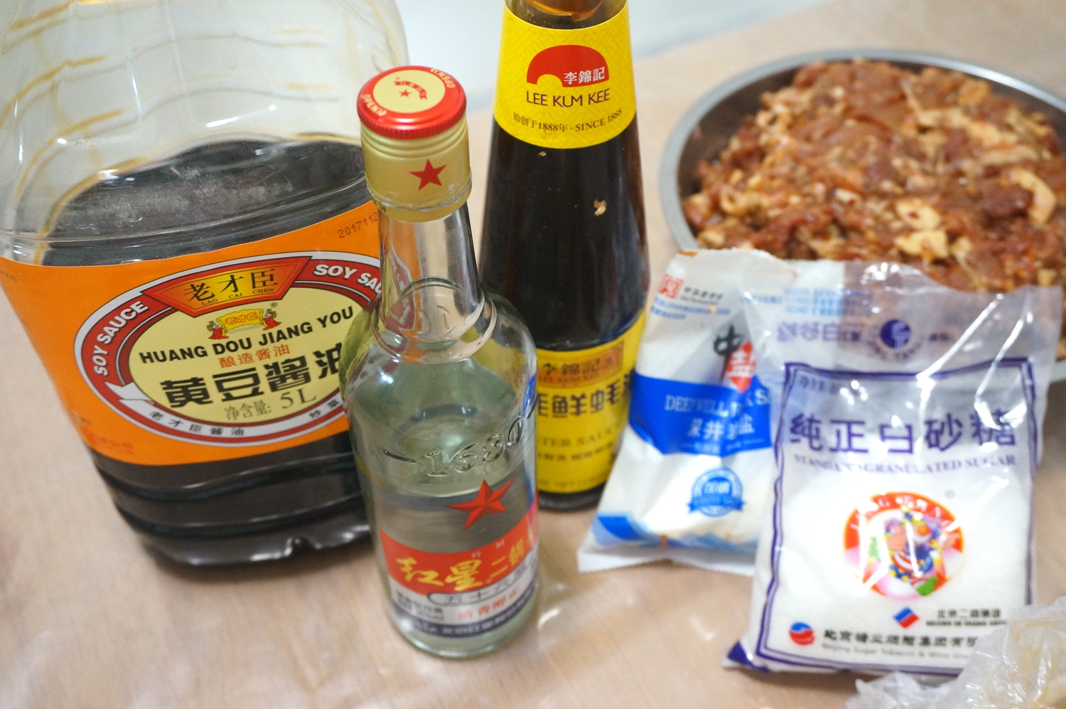 4. 依次倒入高度白酒、生抽、蚝油,用量完全随自己的口味,当然也要注意到酱油的咸度;http://si1.go2yd.com/get-image/0KAiX2rUxVo