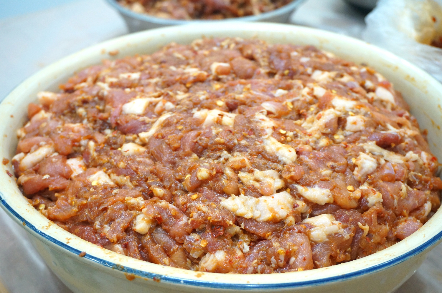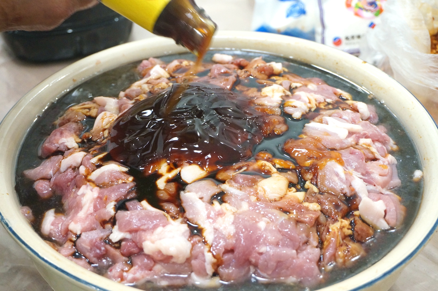 6. 直接下手翻拌吧!适量放些凉水,一是便于味道入肉中,二是在灌的时候肉不粘,灌肠比较顺畅;http://si1.go2yd.com/get-image/0KAiaOE0bfU