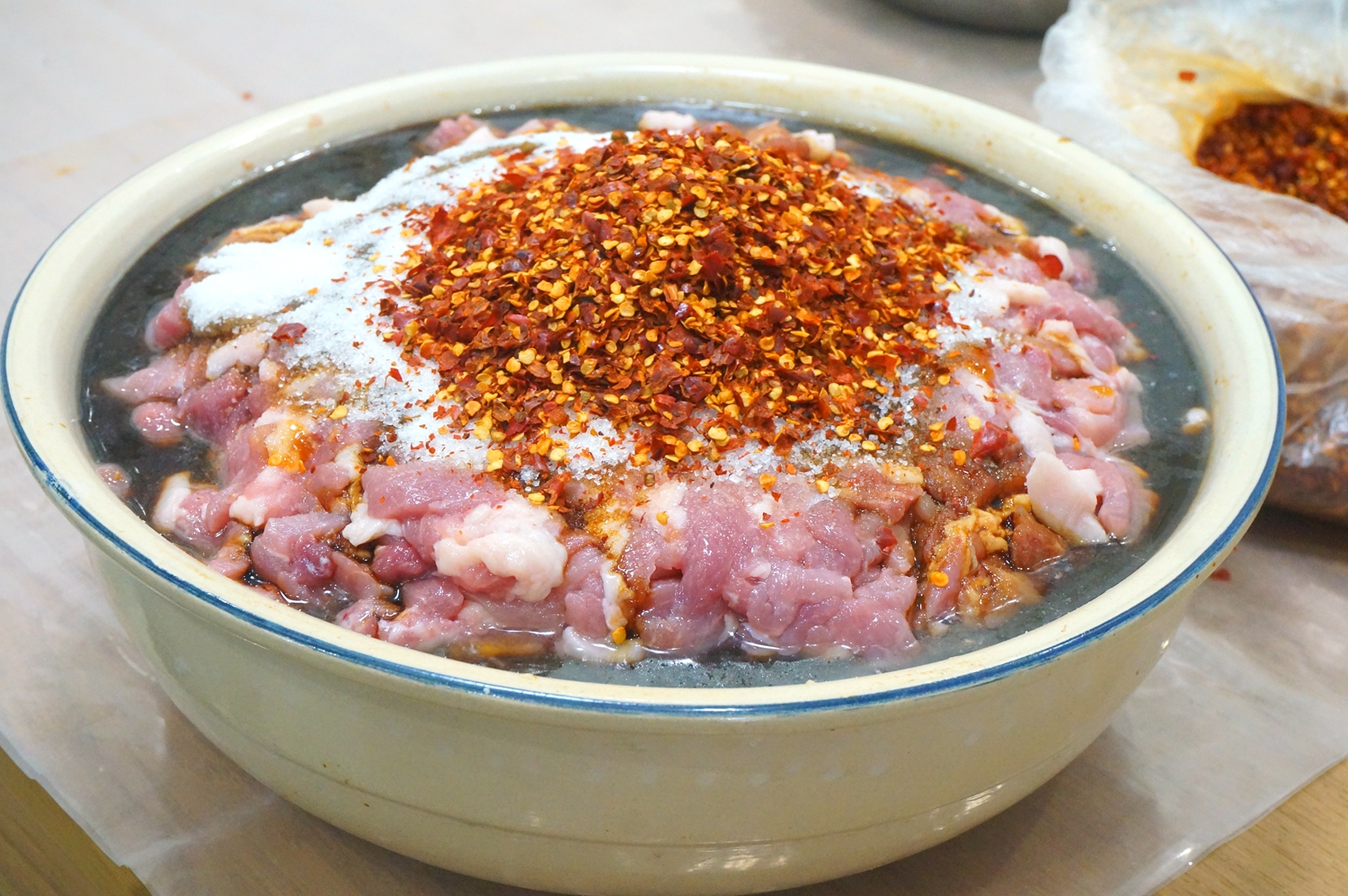 腊肠有肥瘦之分,可以按照自己的口味来选肉。不同部位的肉有不同的口感。我家喜欢用前后臀尖,肉质饱满有弹性,肥瘦适宜。我娘家妈可是勤快人,我跟老公结婚快20年了,结婚前几年,腊肠都是从江西婆家那边做好寄过来,但,终究不能满足全年的消耗啊!于是我妈就开始自己做腊肠。http://si1.go2yd.com/get-image/0KAiQuKGUuu